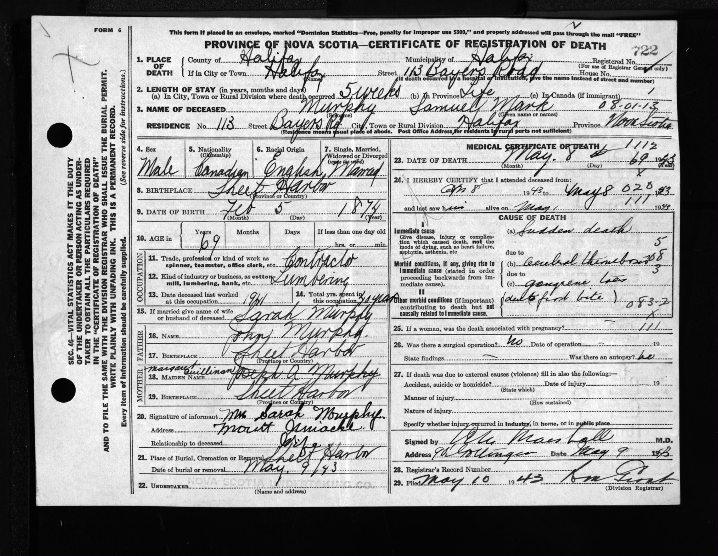 Male Death Registration: Year: 1943 file: 210 number: 722