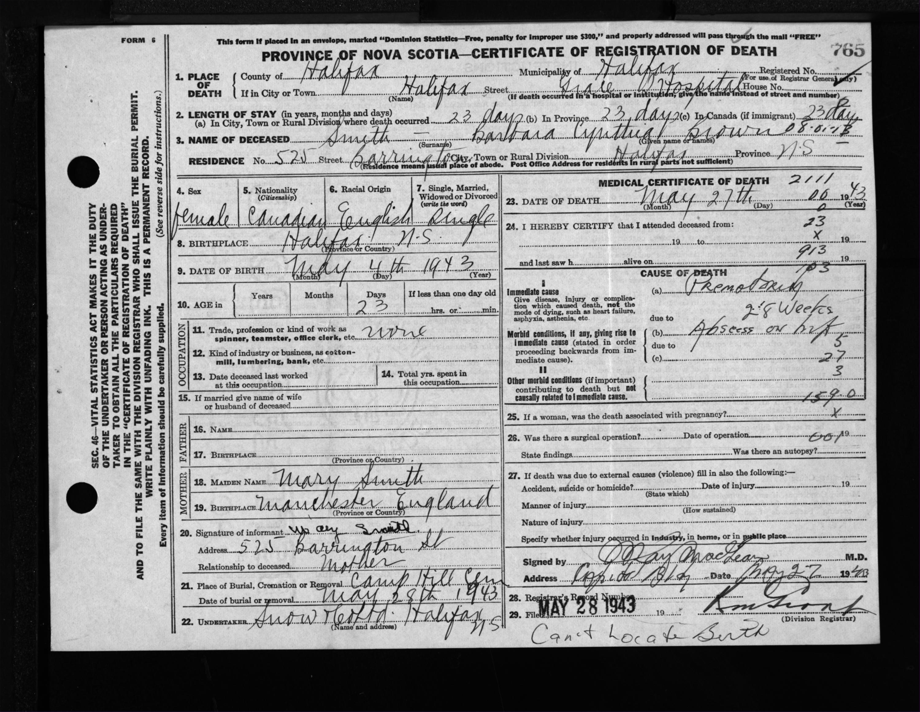 Female Death Registration: Year: 1943 file: 210 number: 765