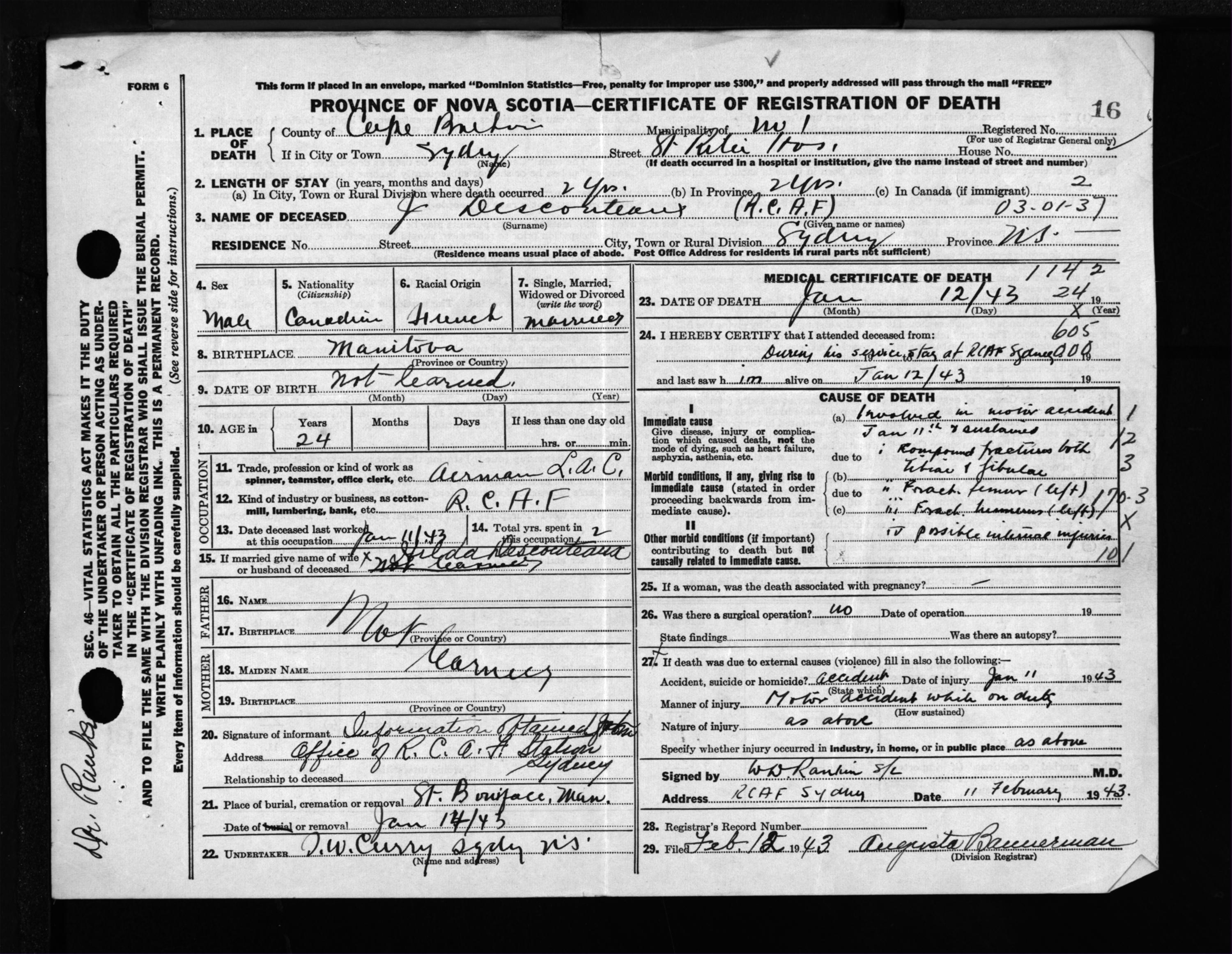 Male Death Registration: Year: 1943 file: 211 number: 16