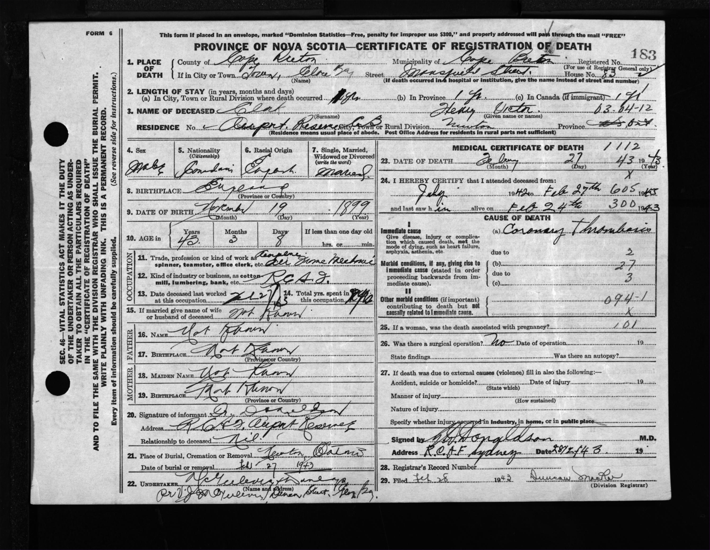 Male Death Registration: Year: 1943 file: 211 number: 183