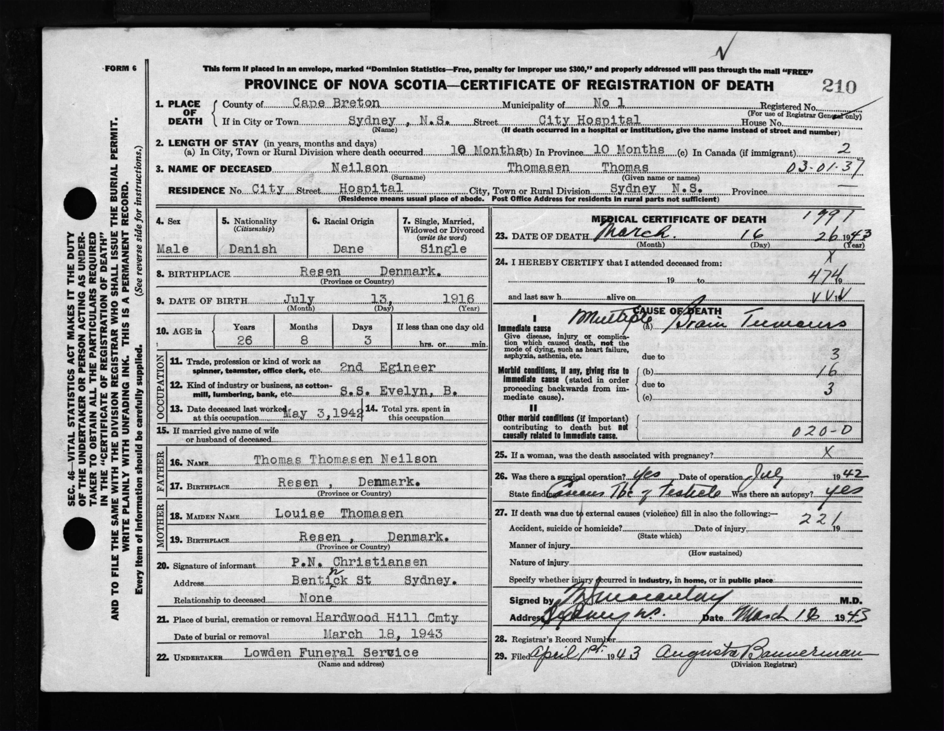 Male Death Registration: Year: 1943 file: 211 number: 210