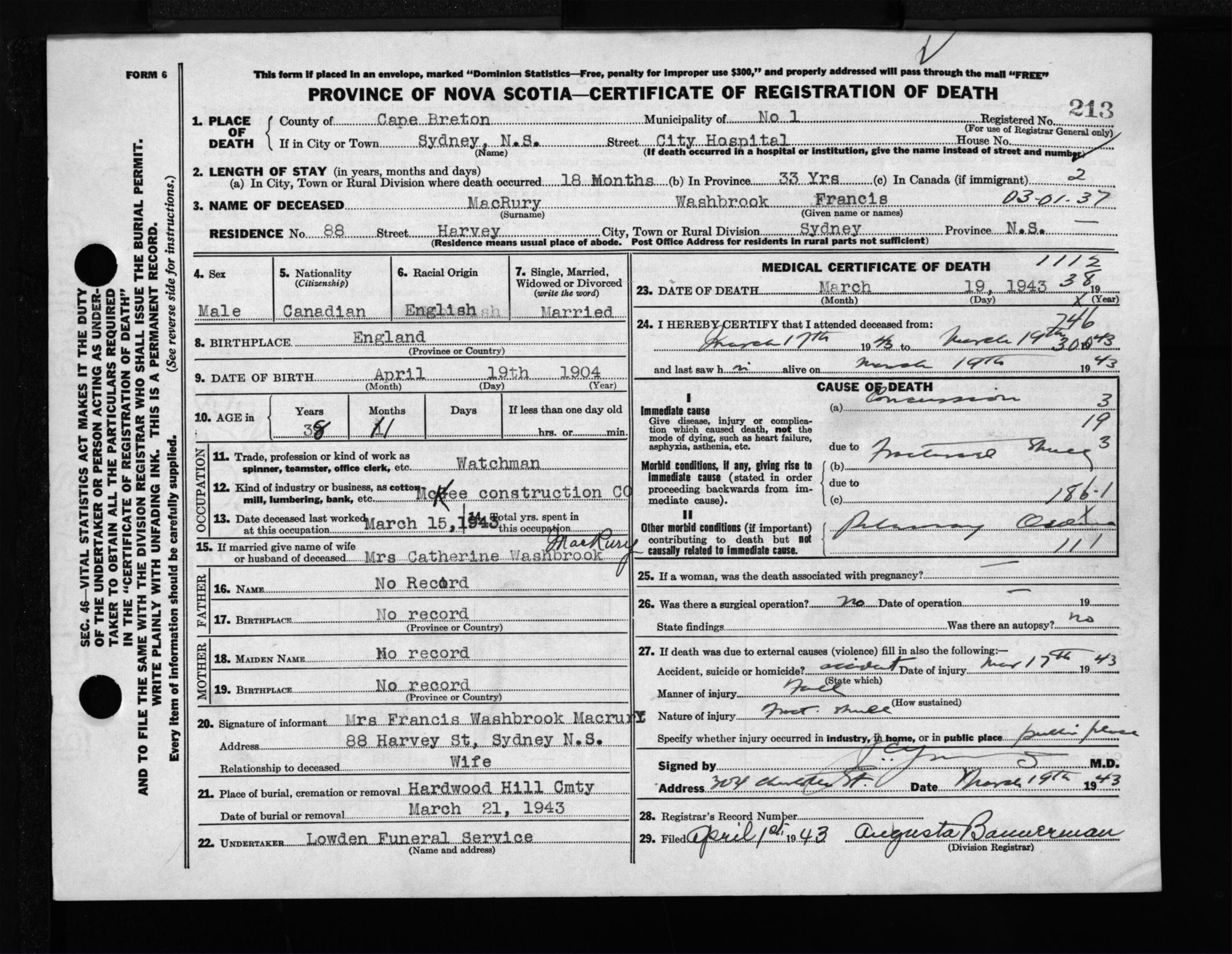 Male Death Registration: Year: 1943 file: 211 number: 213