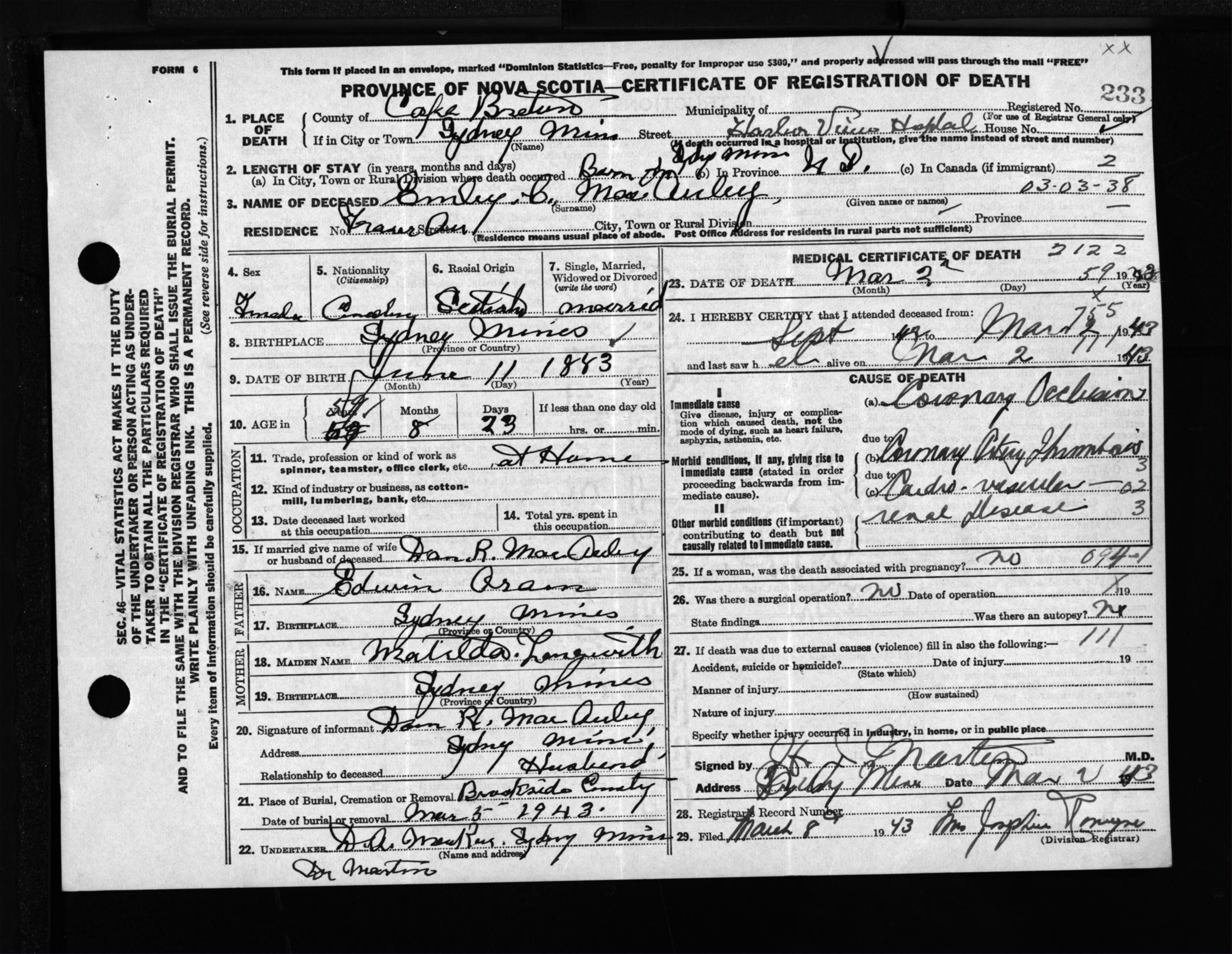 Female Death Registration: Year: 1943 file: 211 number: 233