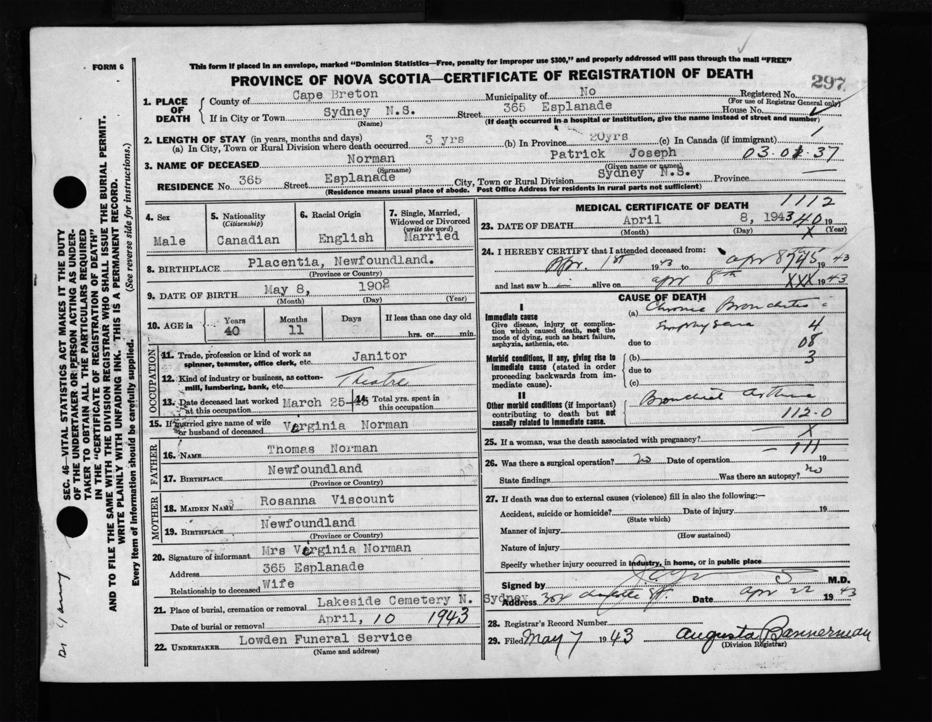 Male Death Registration: Year: 1943 file: 211 number: 297