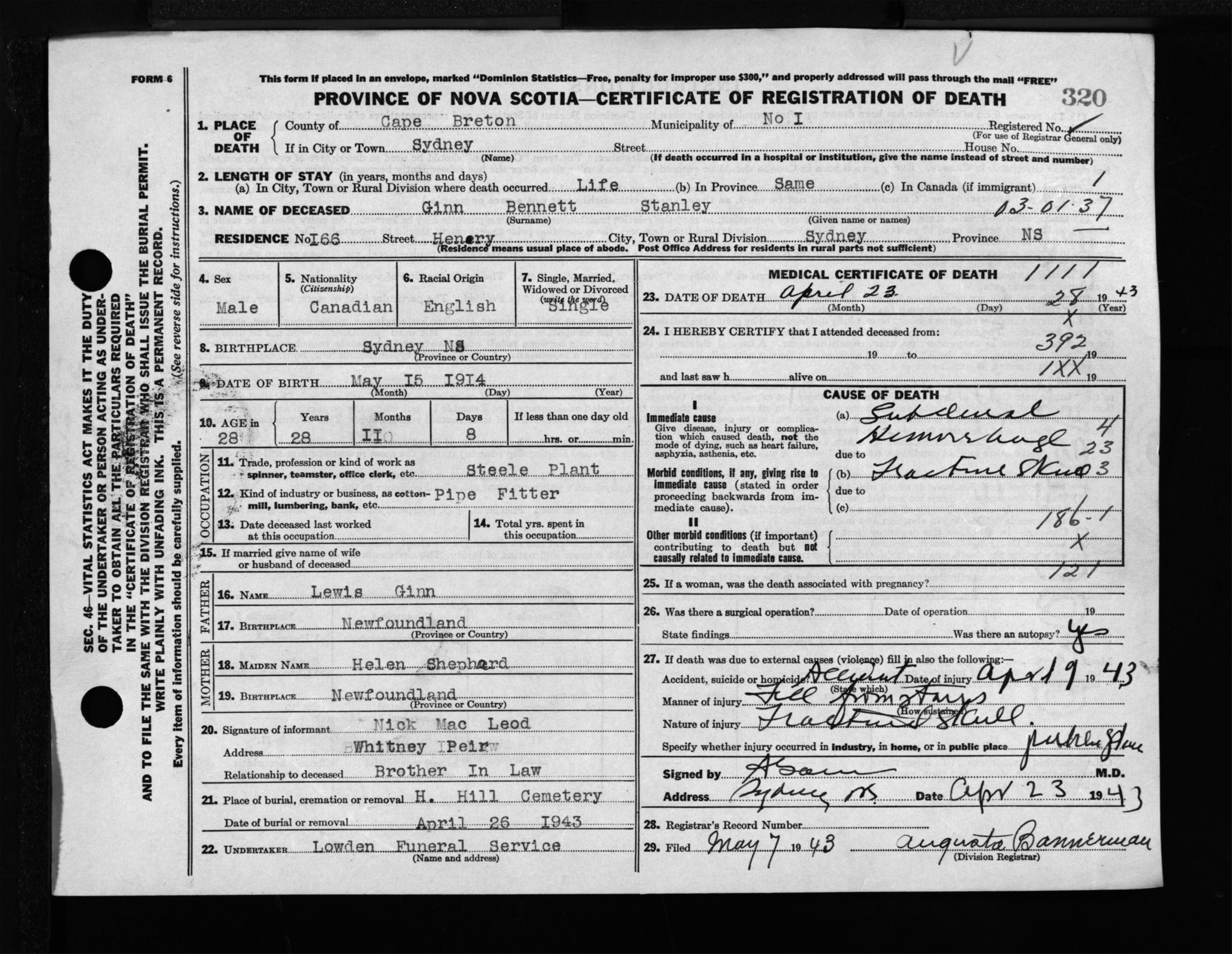 Male Death Registration: Year: 1943 file: 211 number: 320