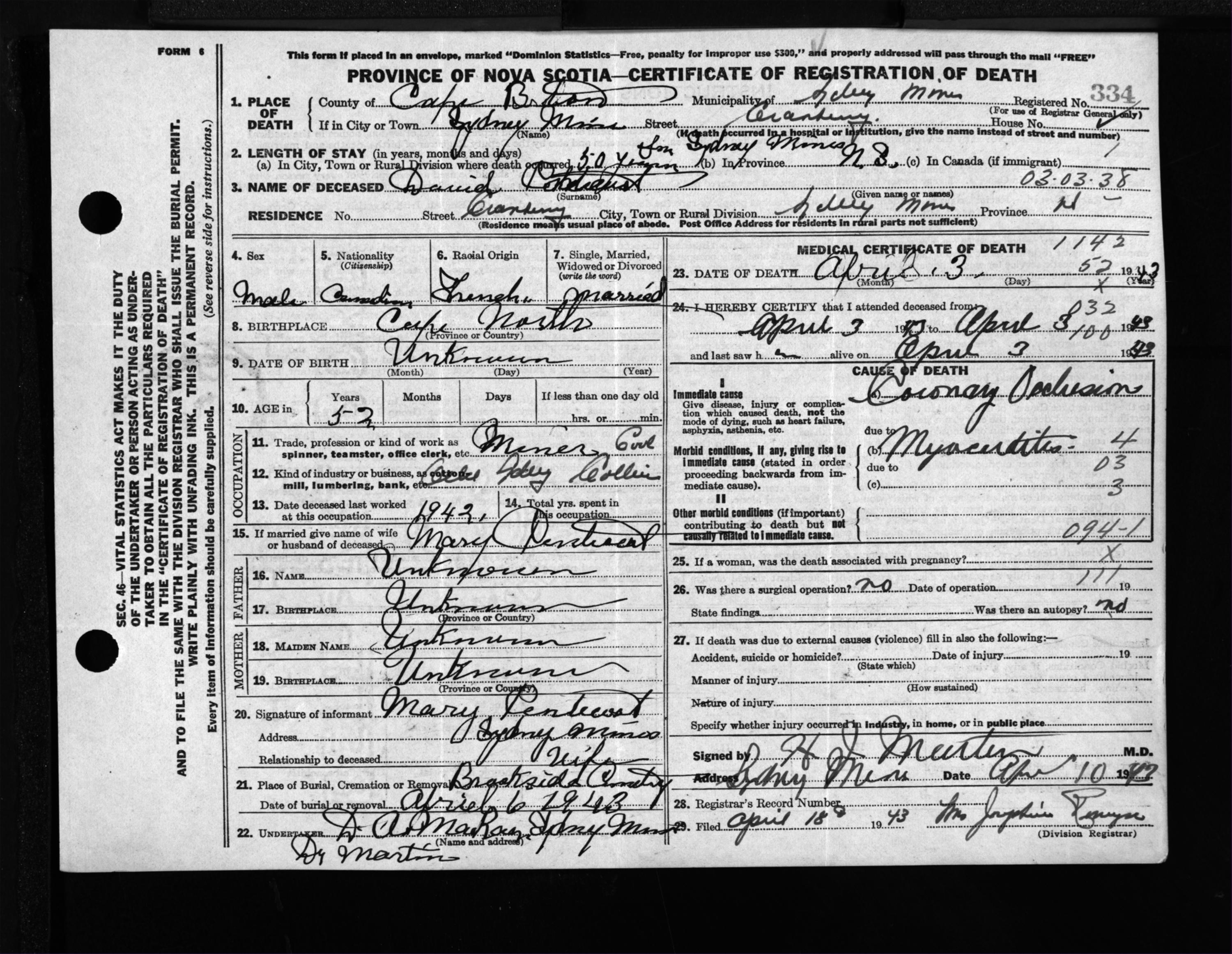 Male Death Registration: Year: 1943 file: 211 number: 334