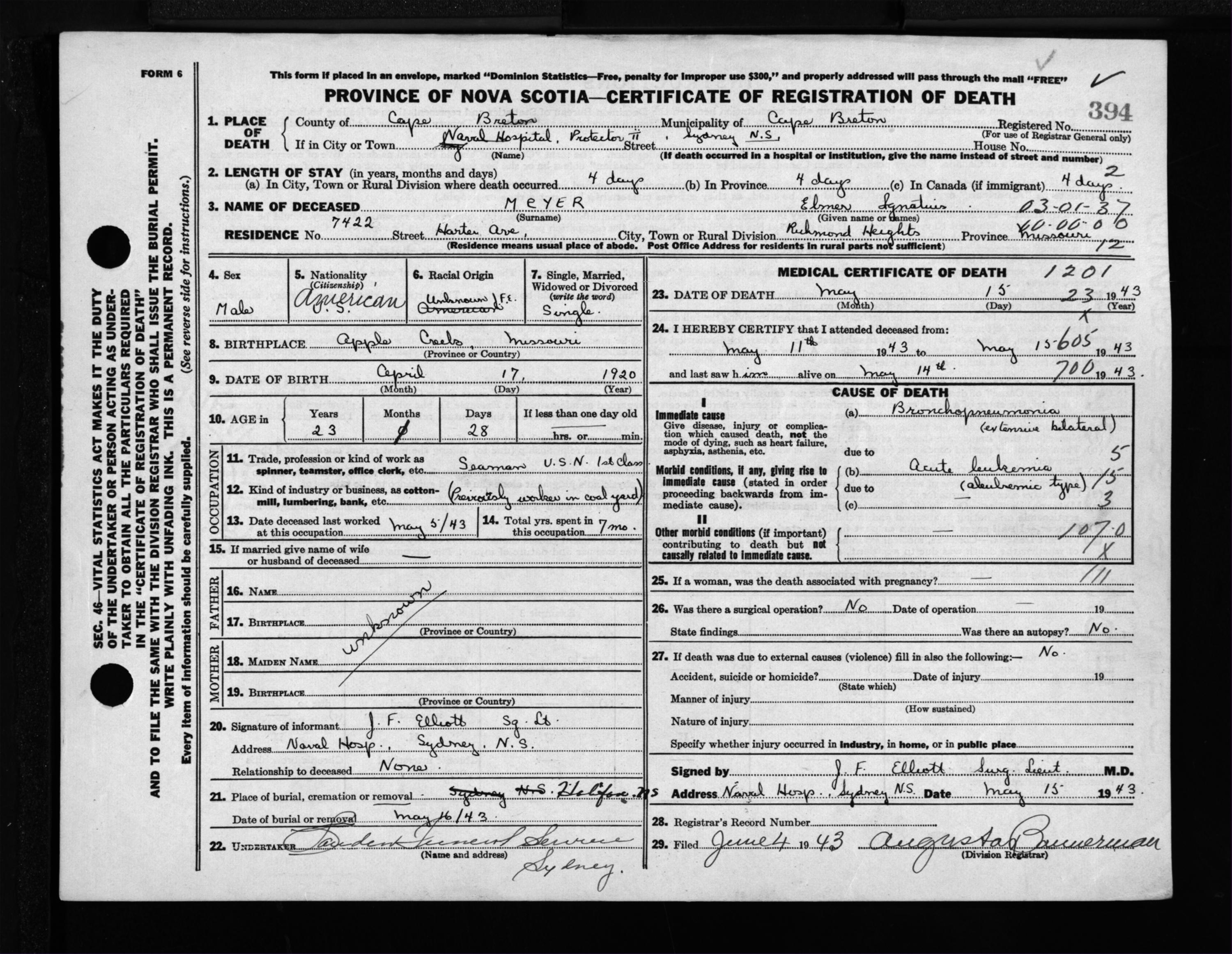 Male Death Registration: Year: 1943 file: 211 number: 394