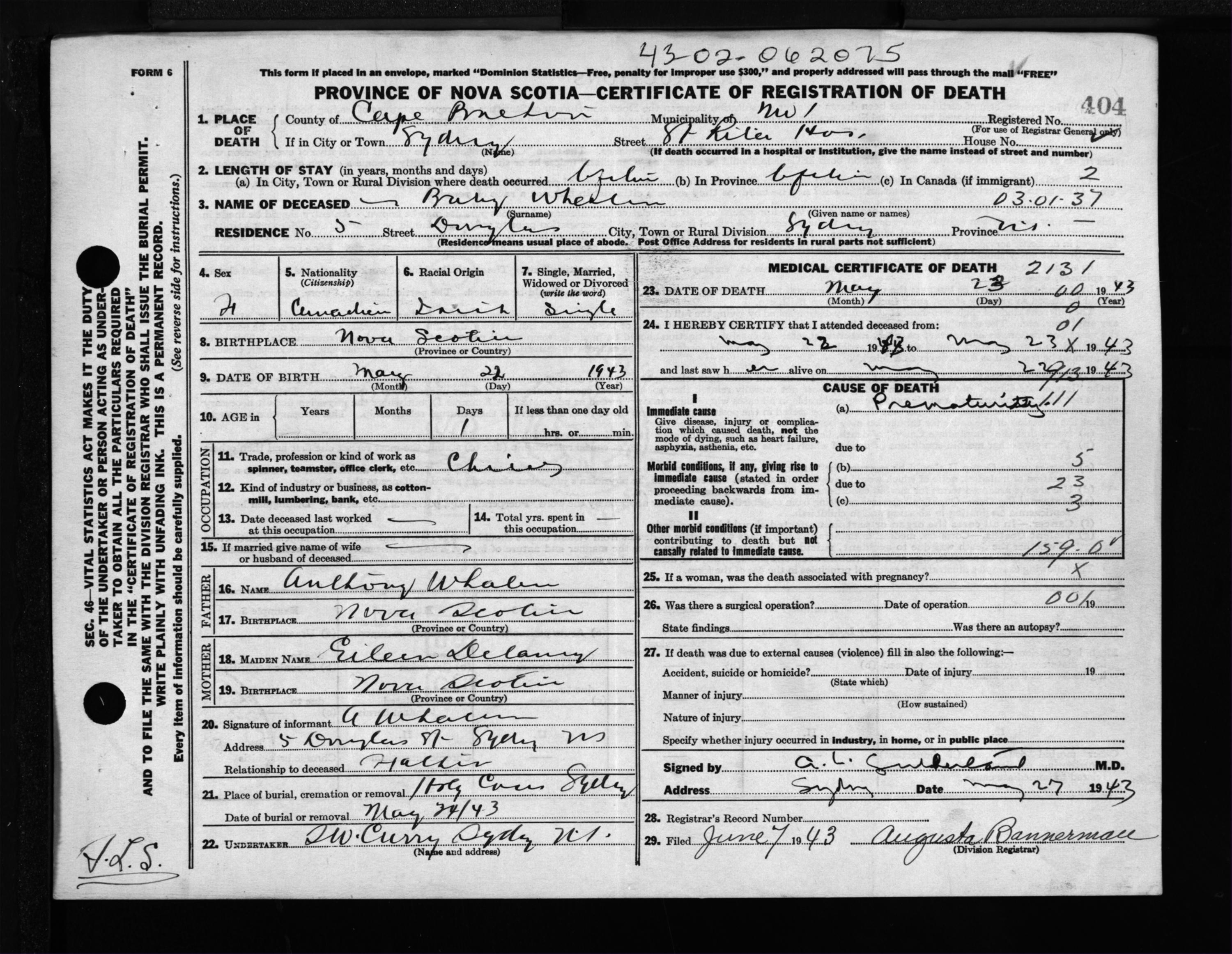 Female Death Registration: Year: 1943 file: 211 number: 404