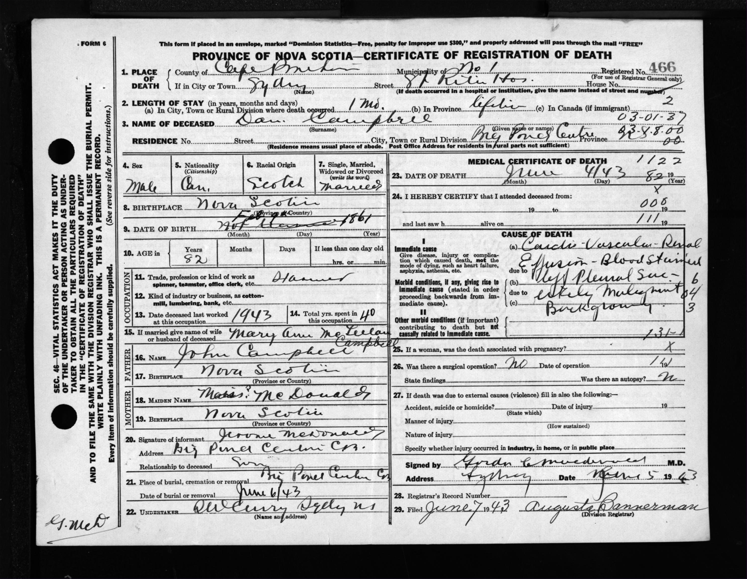 Male Death Registration: Year: 1943 file: 211 number: 466