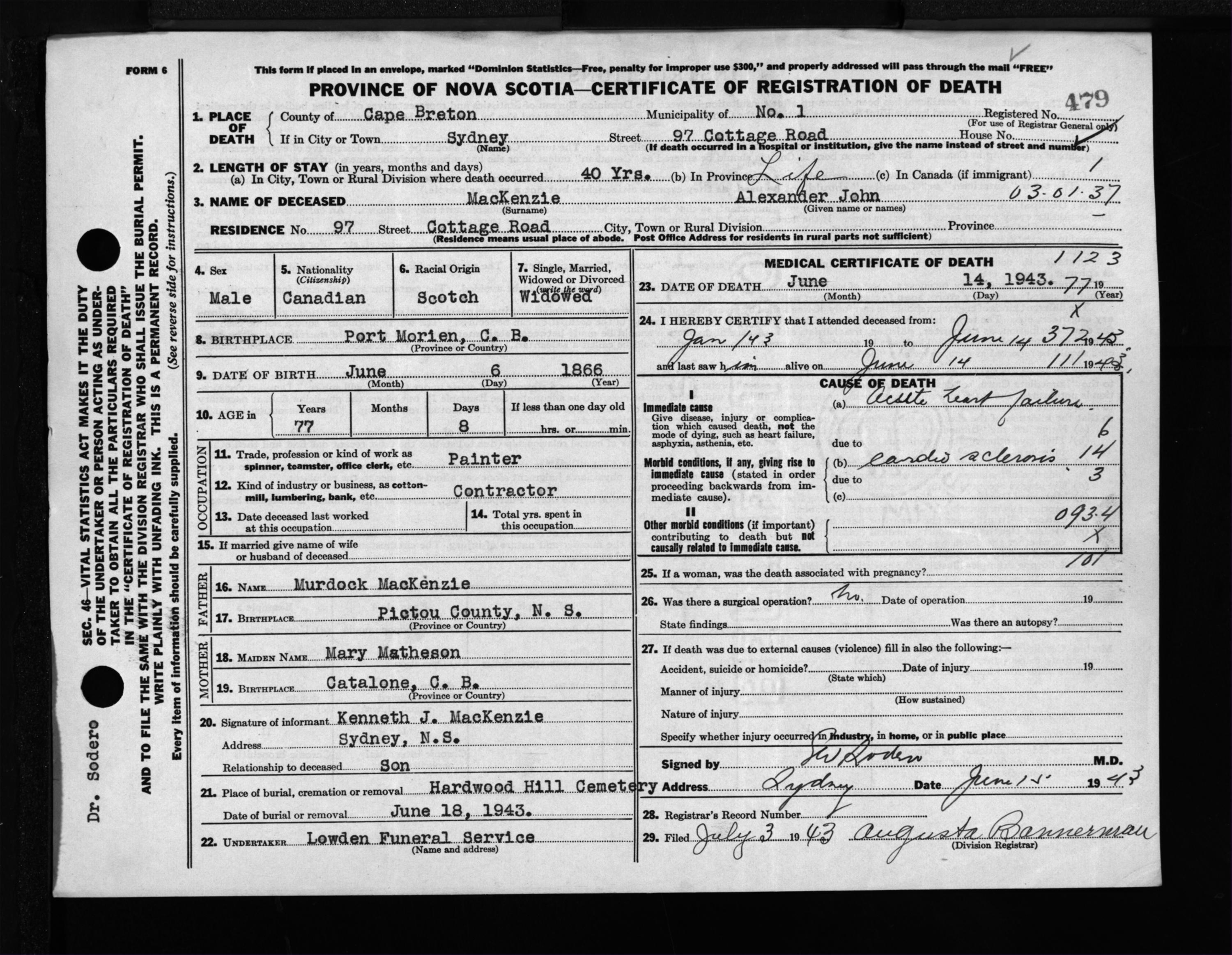 Male Death Registration: Year: 1943 file: 211 number: 479