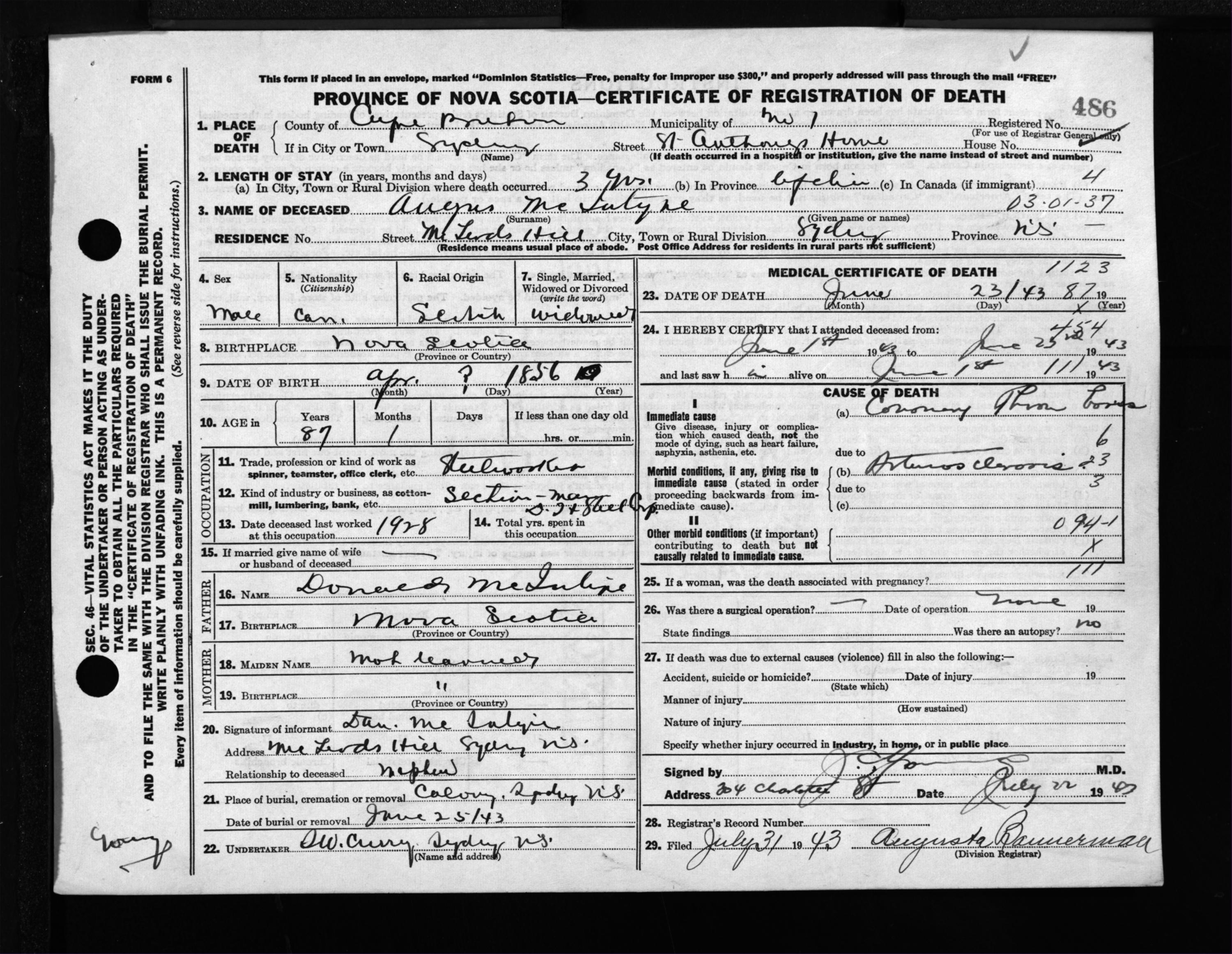 Male Death Registration: Year: 1943 file: 211 number: 486