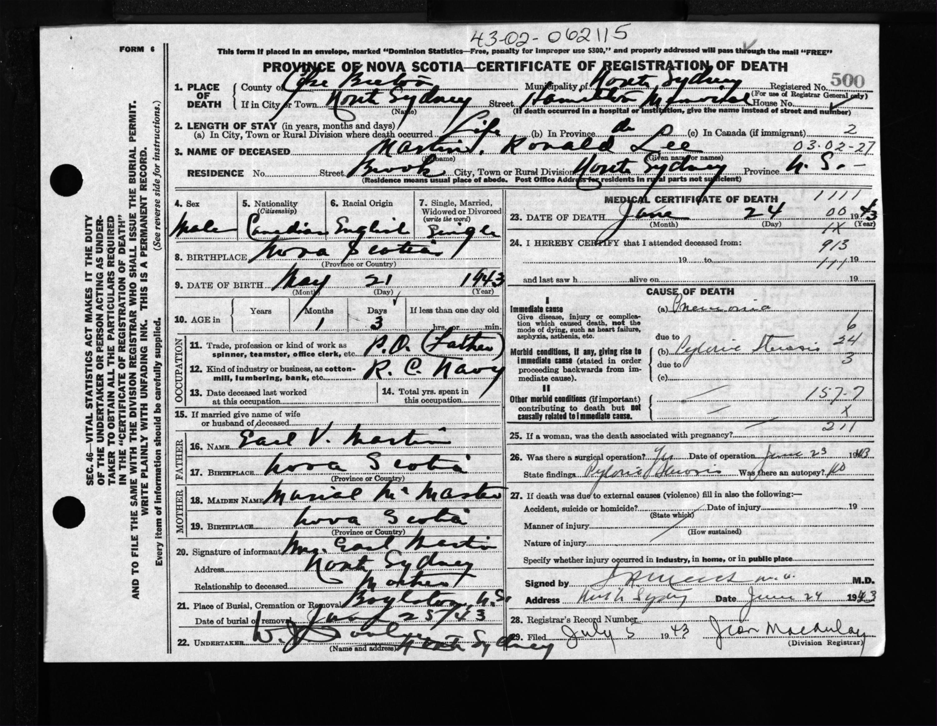 Male Death Registration: Year: 1943 file: 211 number: 500