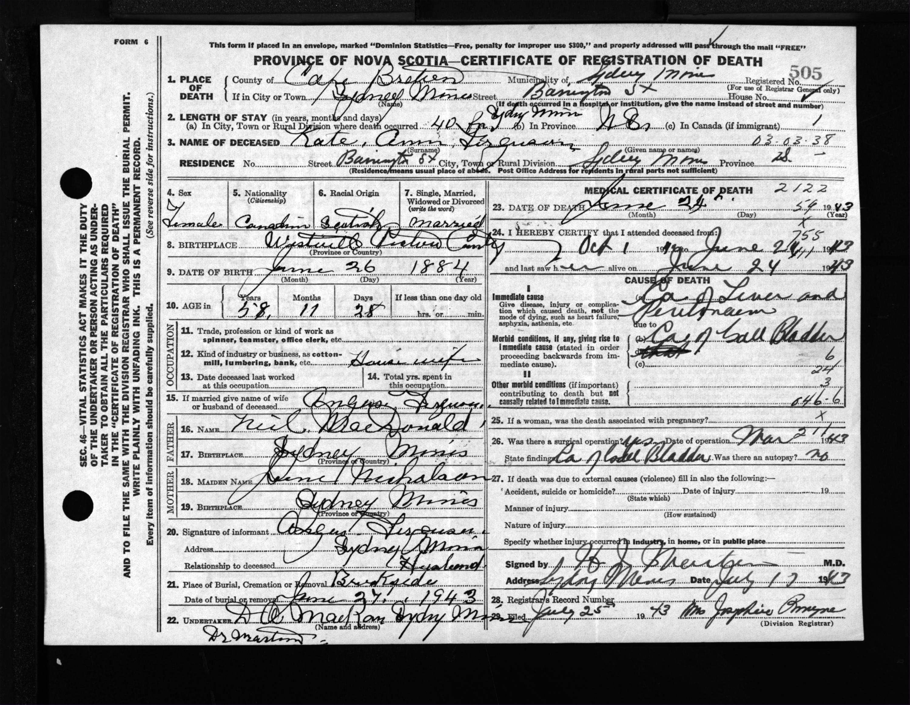 Female Death Registration: Year: 1943 file: 211 number: 505