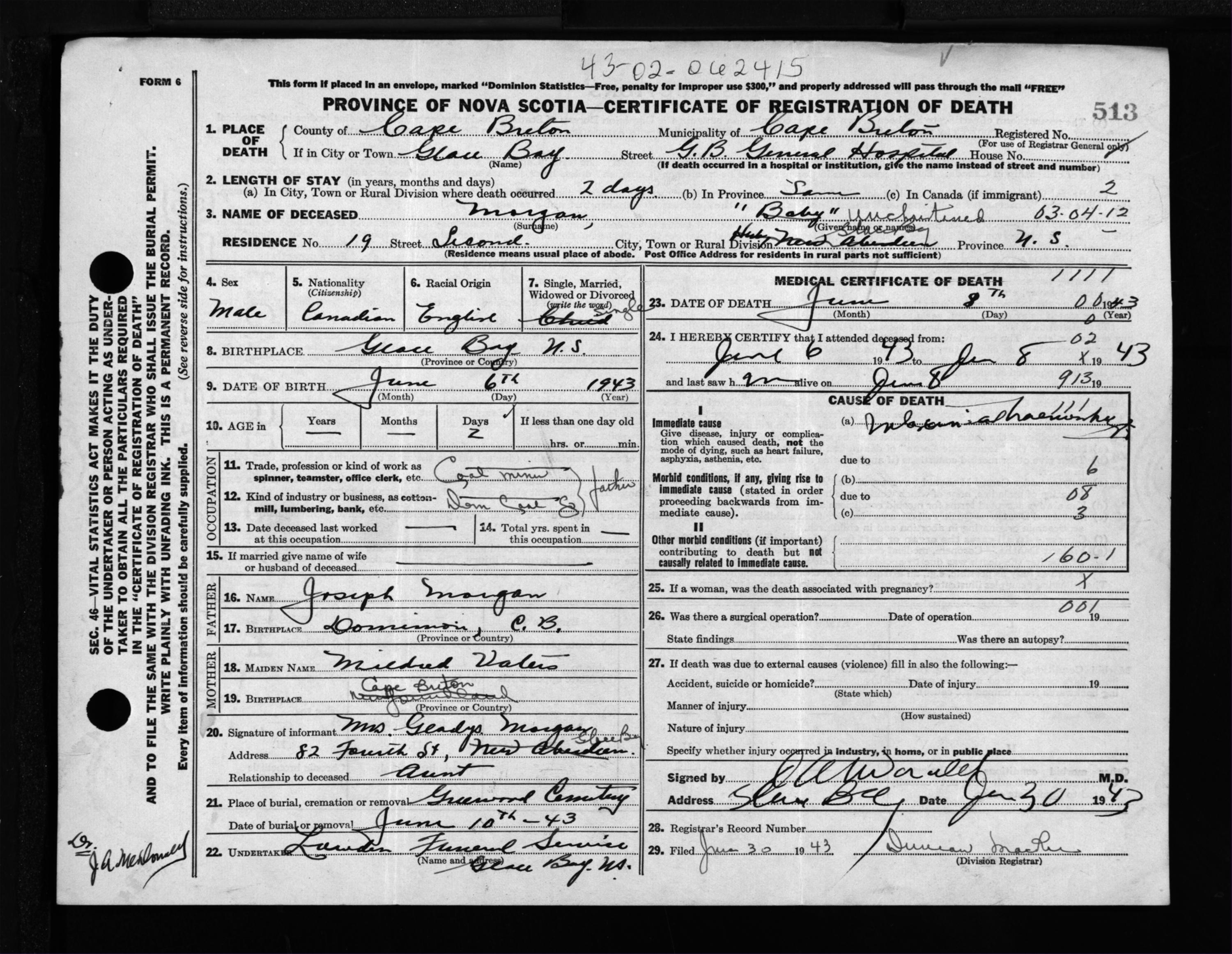 Male Death Registration: Year: 1943 file: 211 number: 513