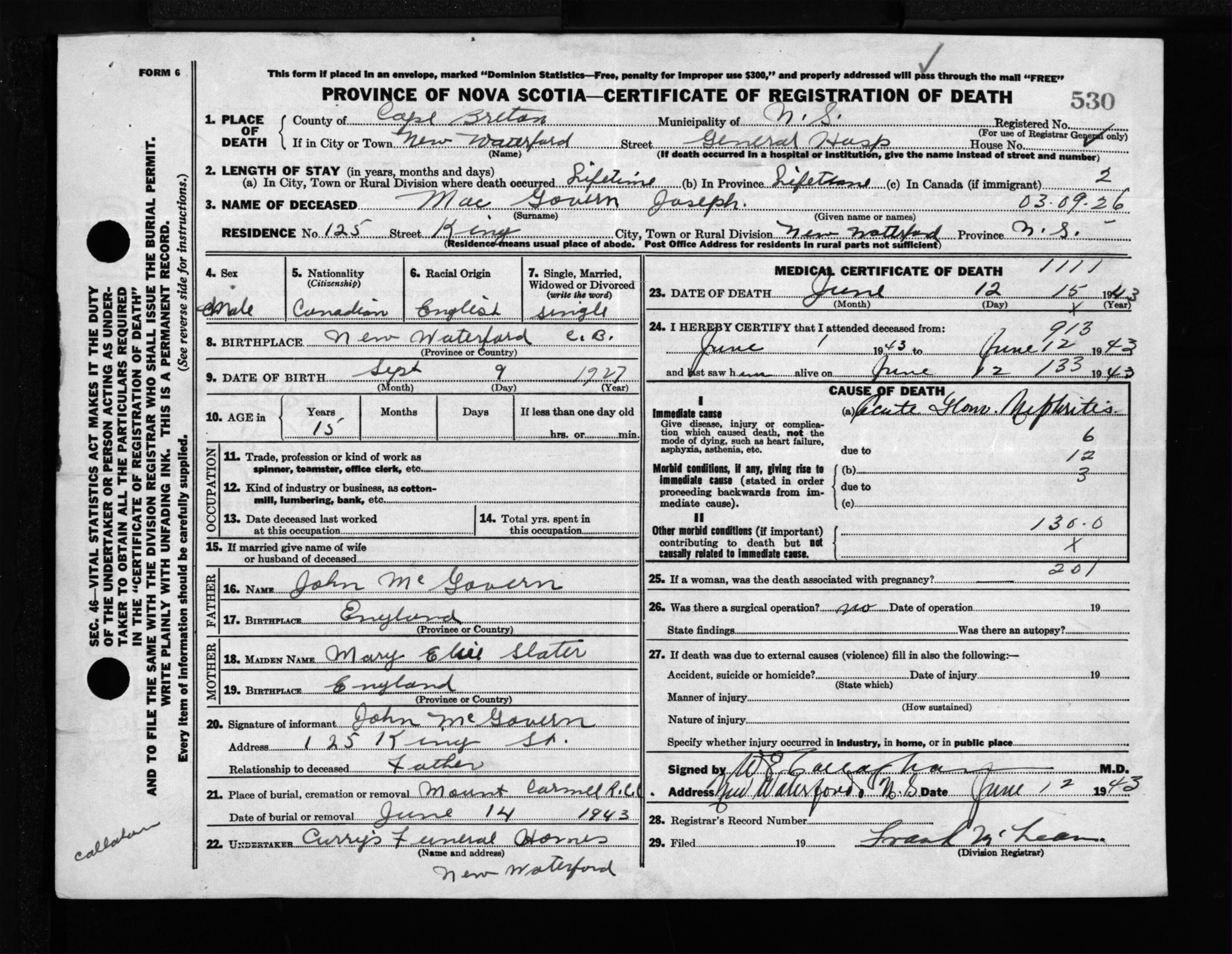 Male Death Registration: Year: 1943 file: 211 number: 530