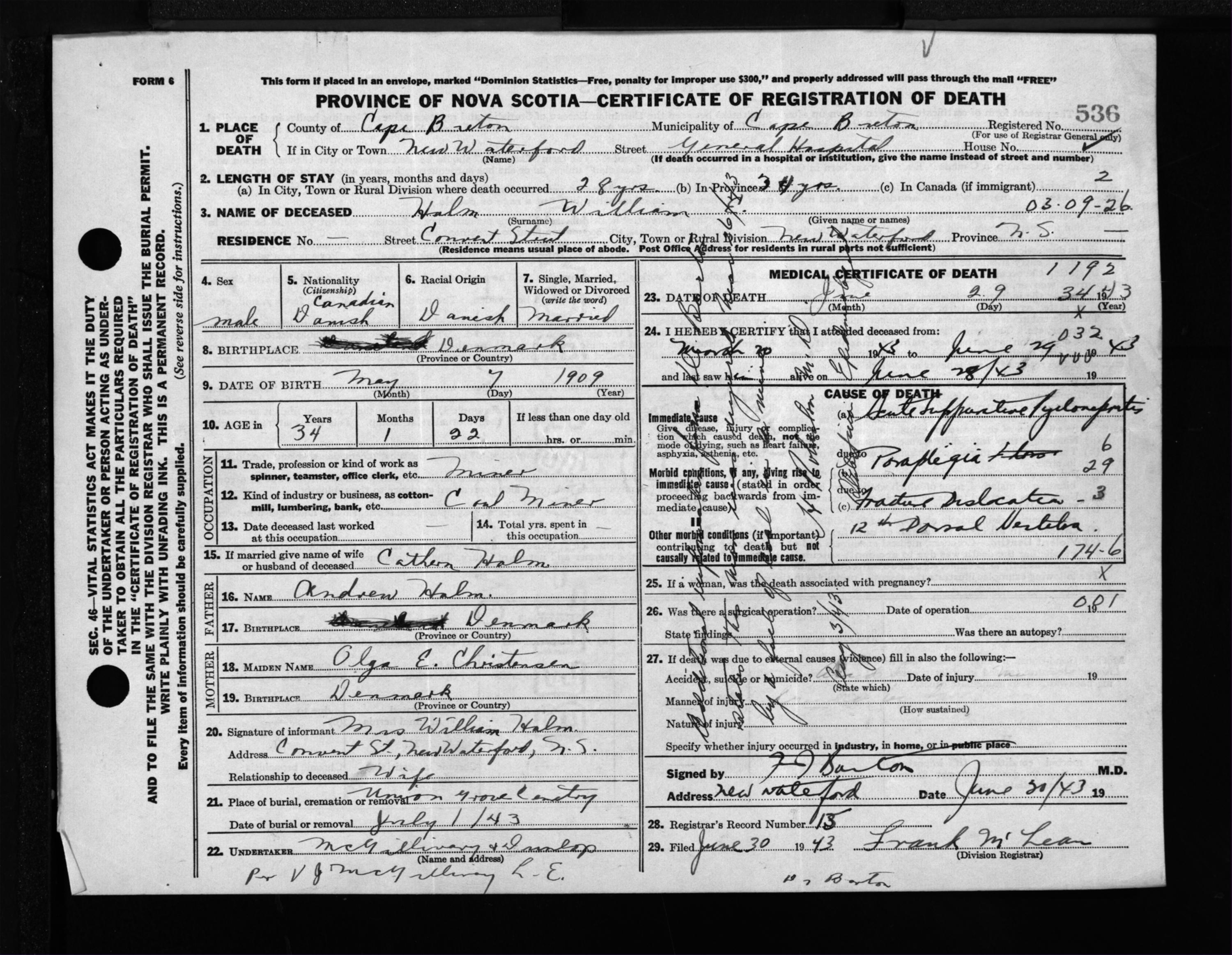 Male Death Registration: Year: 1943 file: 211 number: 536