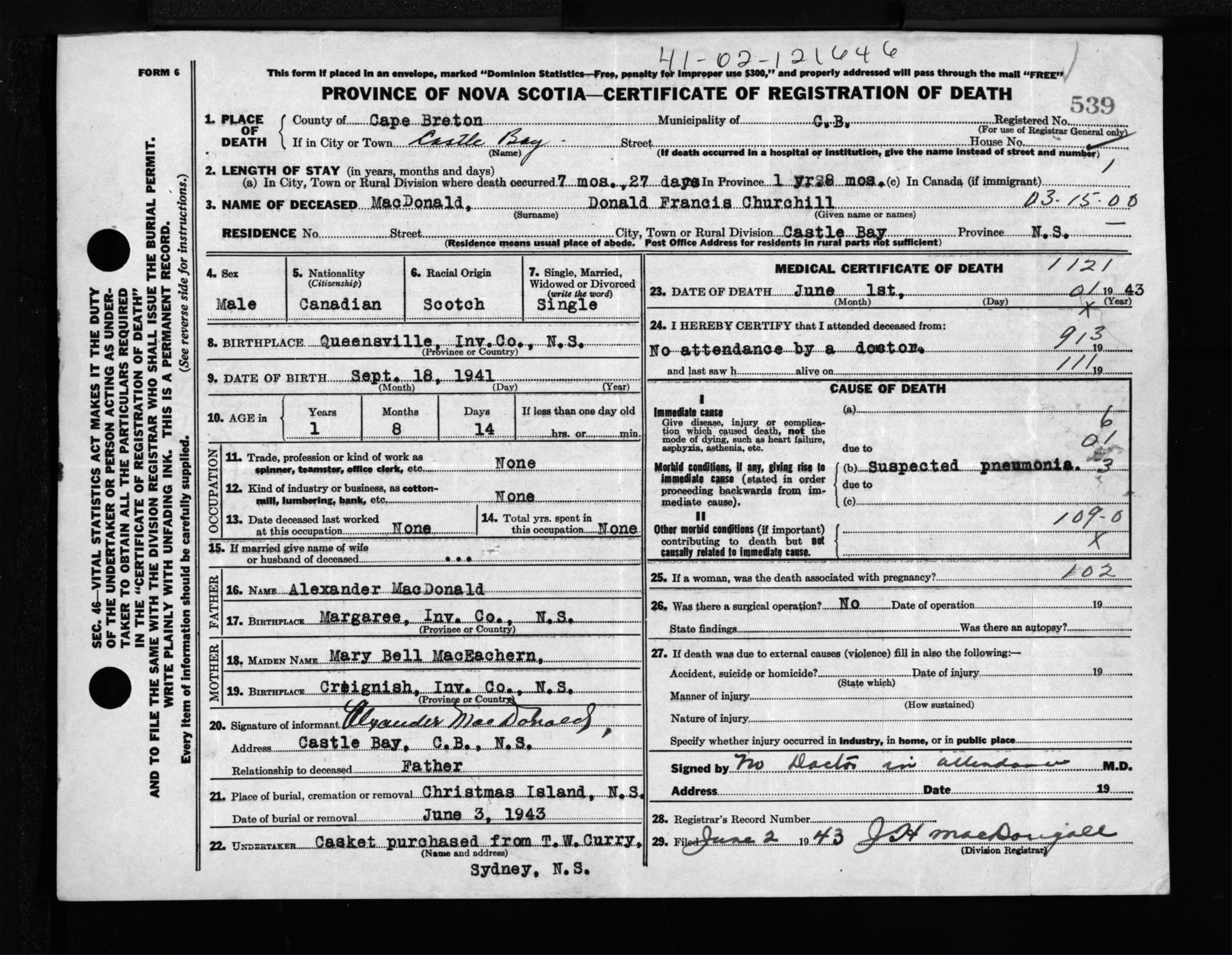 Male Death Registration: Year: 1943 file: 211 number: 539