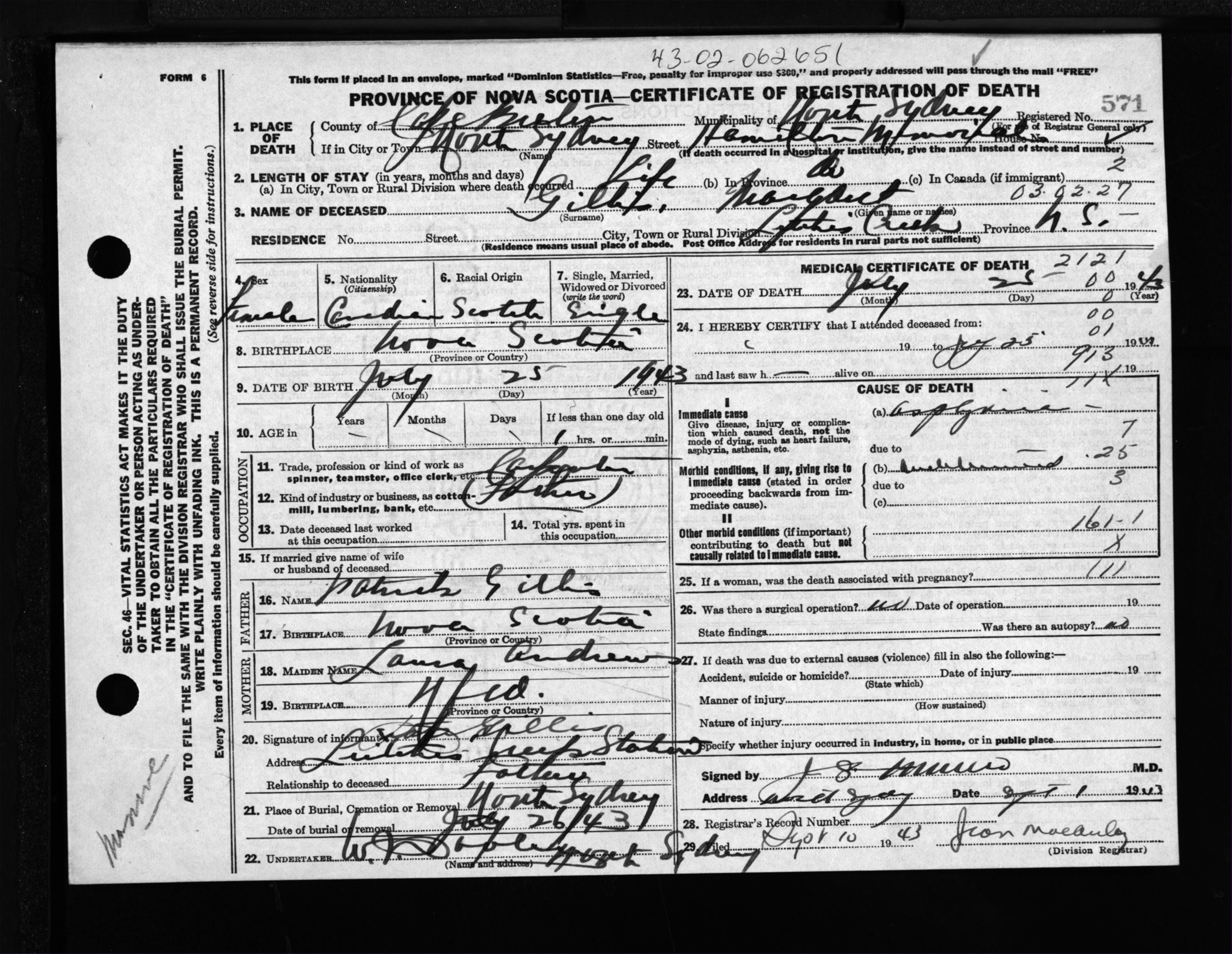 Female Death Registration: Year: 1943 file: 211 number: 571
