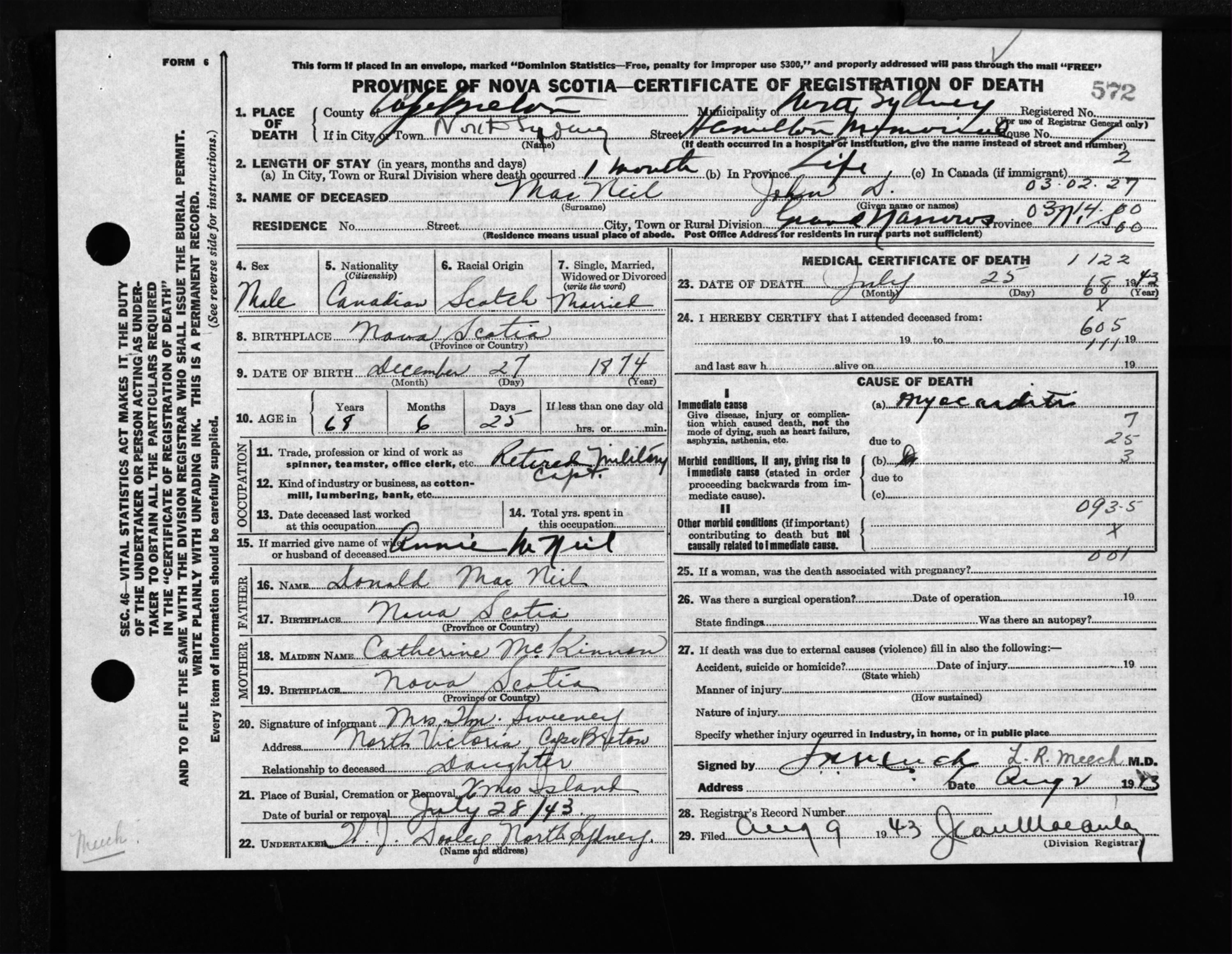 Male Death Registration: Year: 1943 file: 211 number: 572