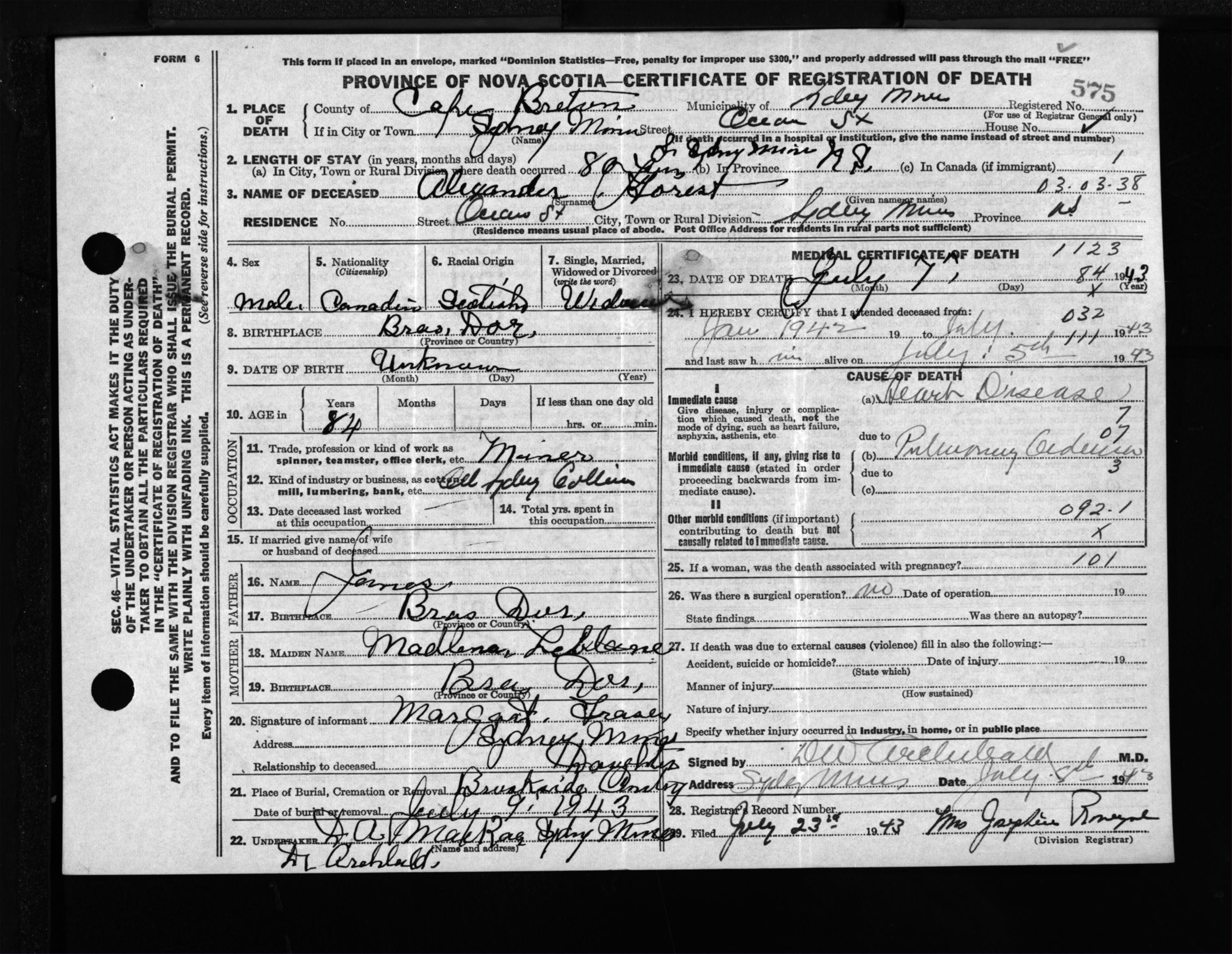 Male Death Registration: Year: 1943 file: 211 number: 575