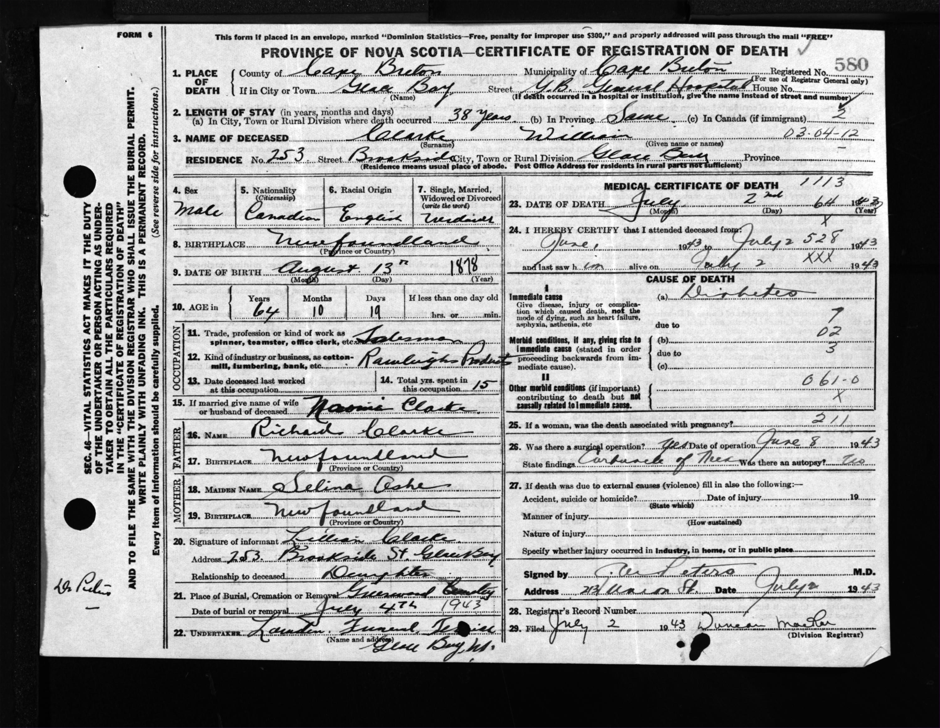 Male Death Registration: Year: 1943 file: 211 number: 580