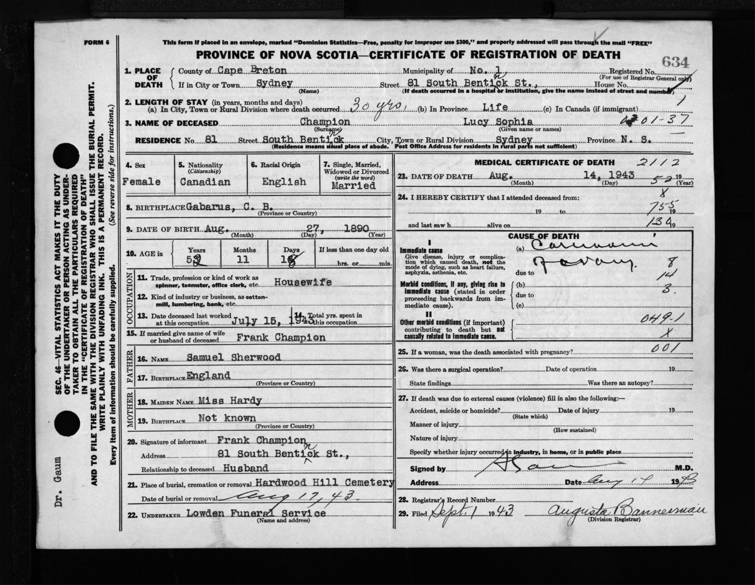 Female Death Registration: Year: 1943 file: 211 number: 634