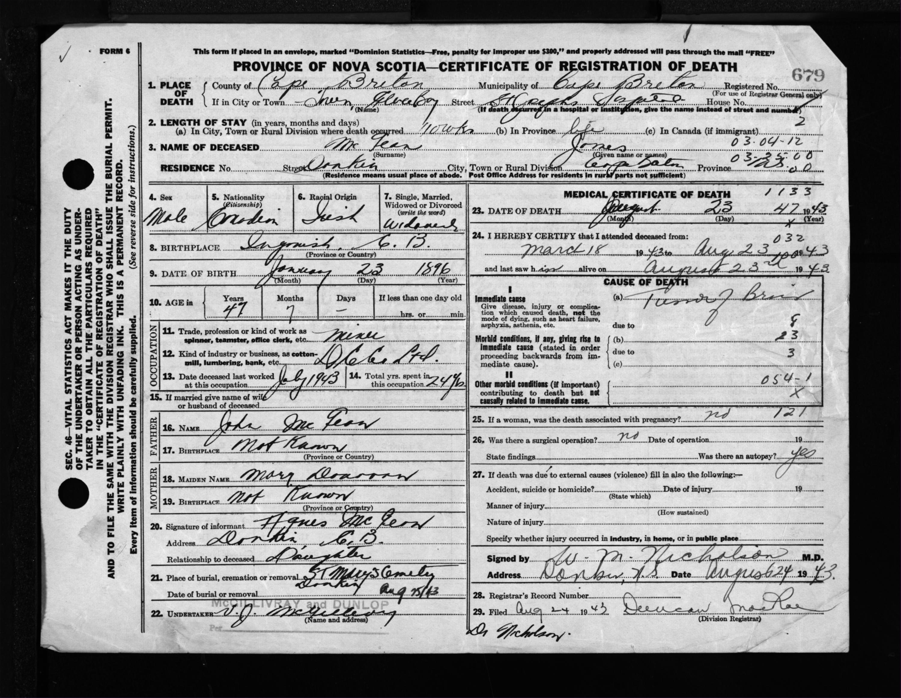 Male Death Registration: Year: 1943 file: 211 number: 679