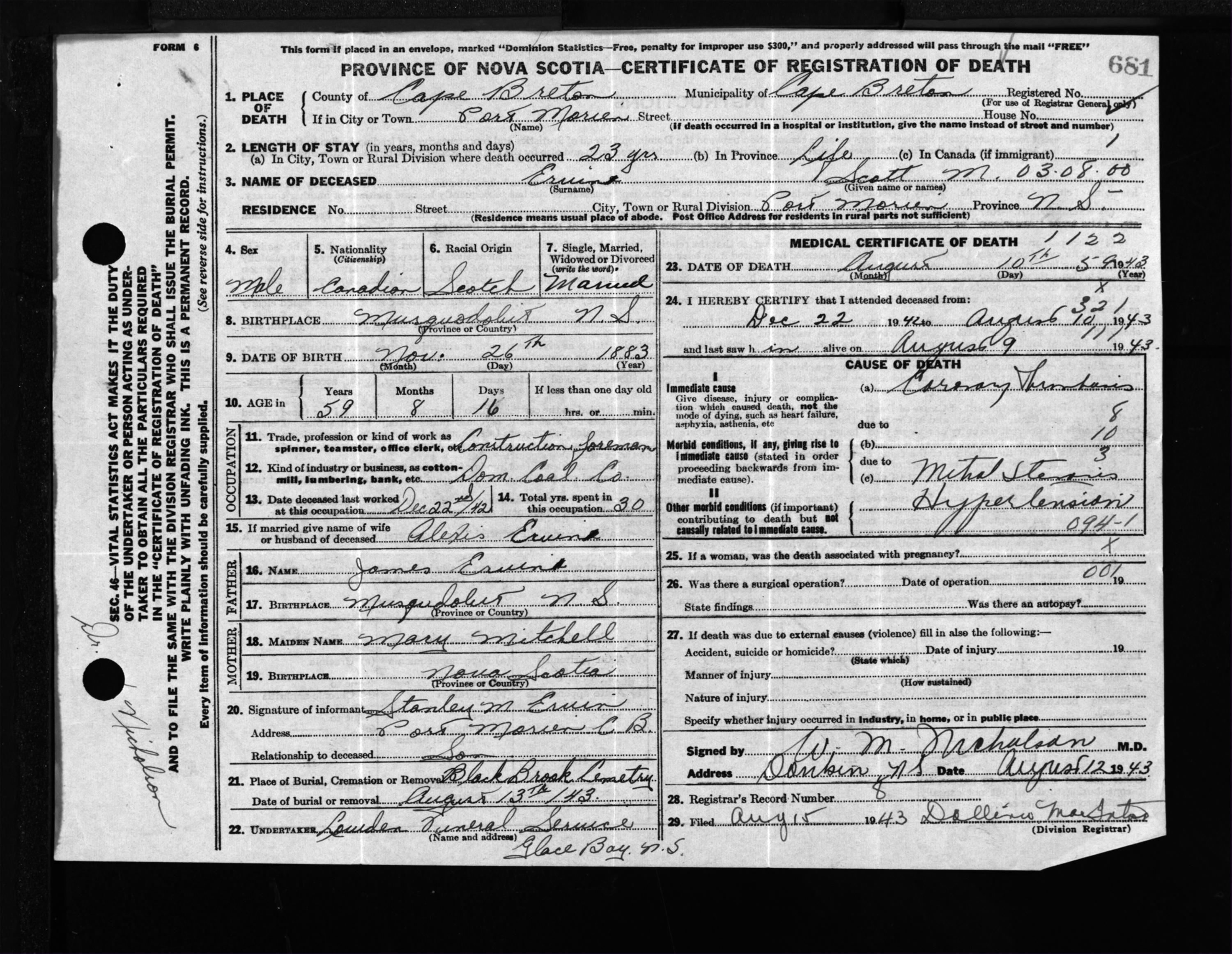 Male Death Registration: Year: 1943 file: 211 number: 681