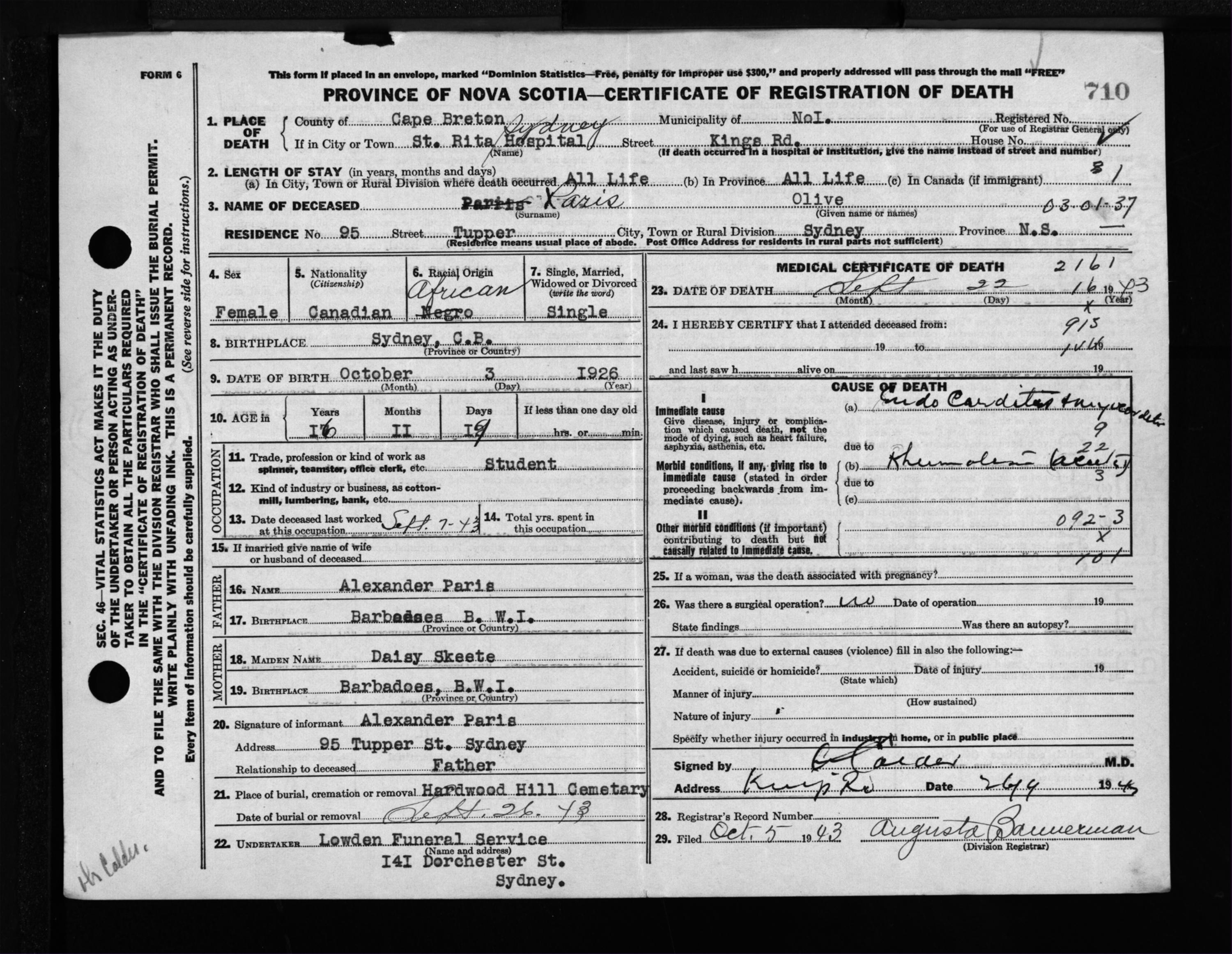 Female Death Registration: Year: 1943 file: 211 number: 710