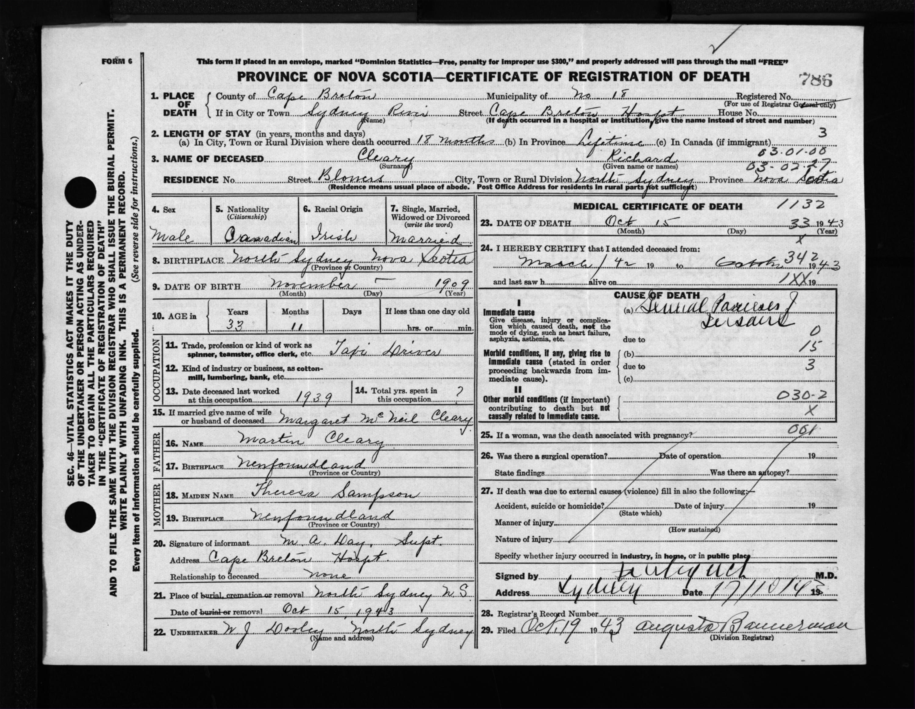 Male Death Registration: Year: 1943 file: 211 number: 786