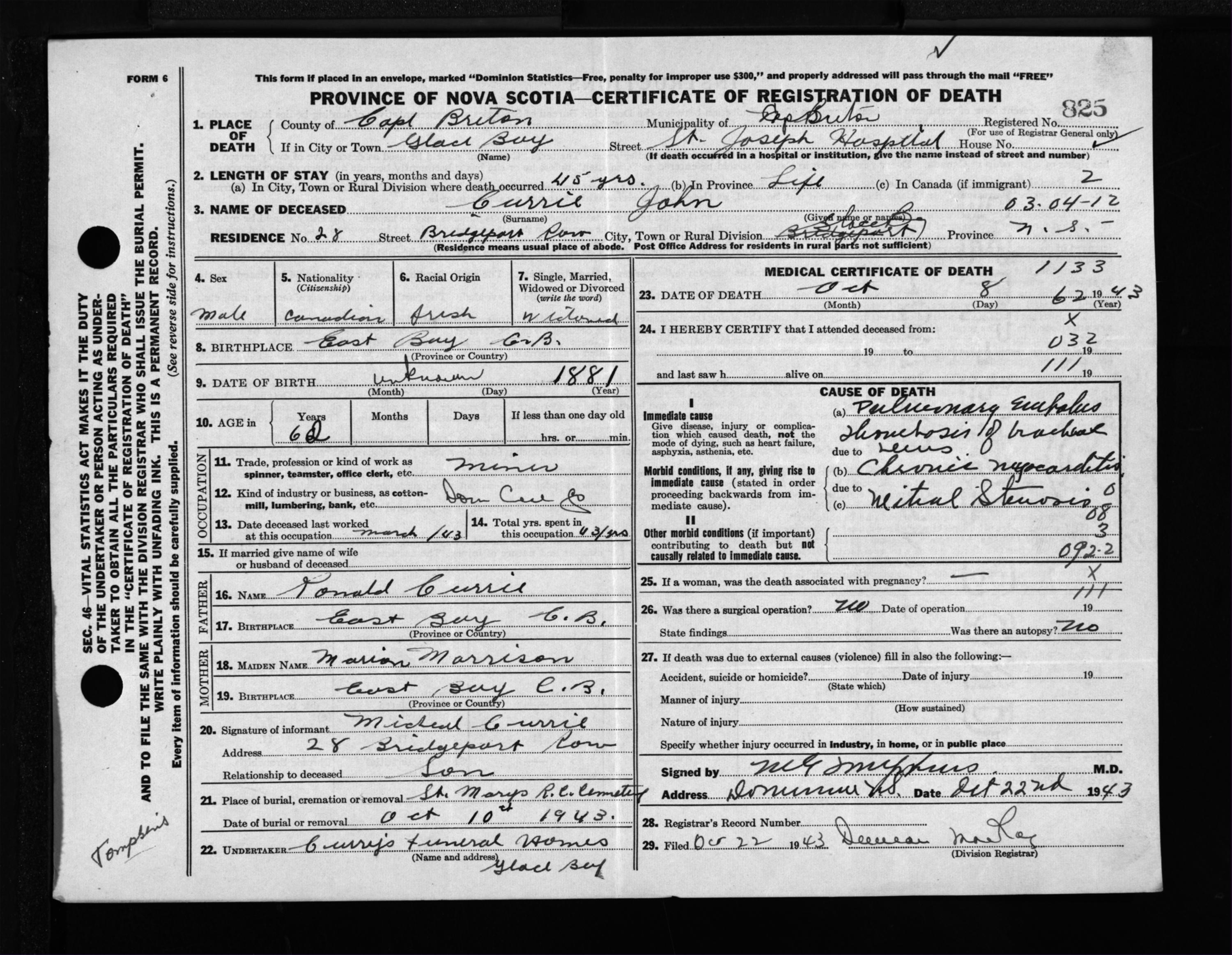 Male Death Registration: Year: 1943 file: 211 number: 825