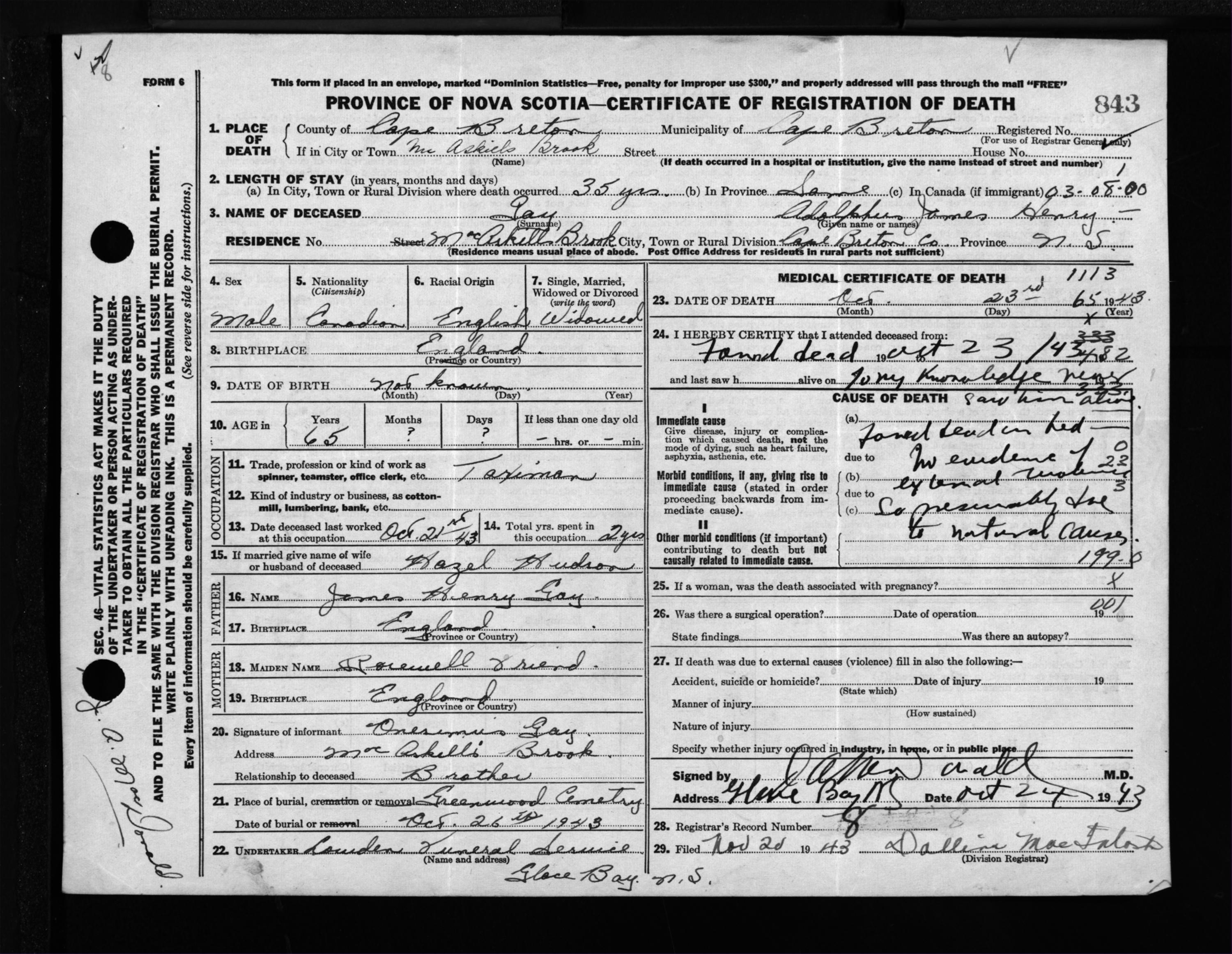 Male Death Registration: Year: 1943 file: 211 number: 843