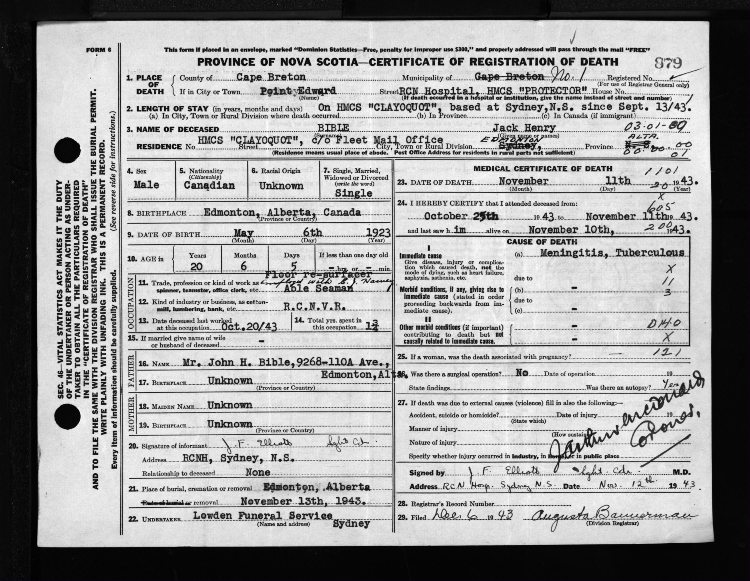 Male Death Registration: Year: 1943 file: 211 number: 879