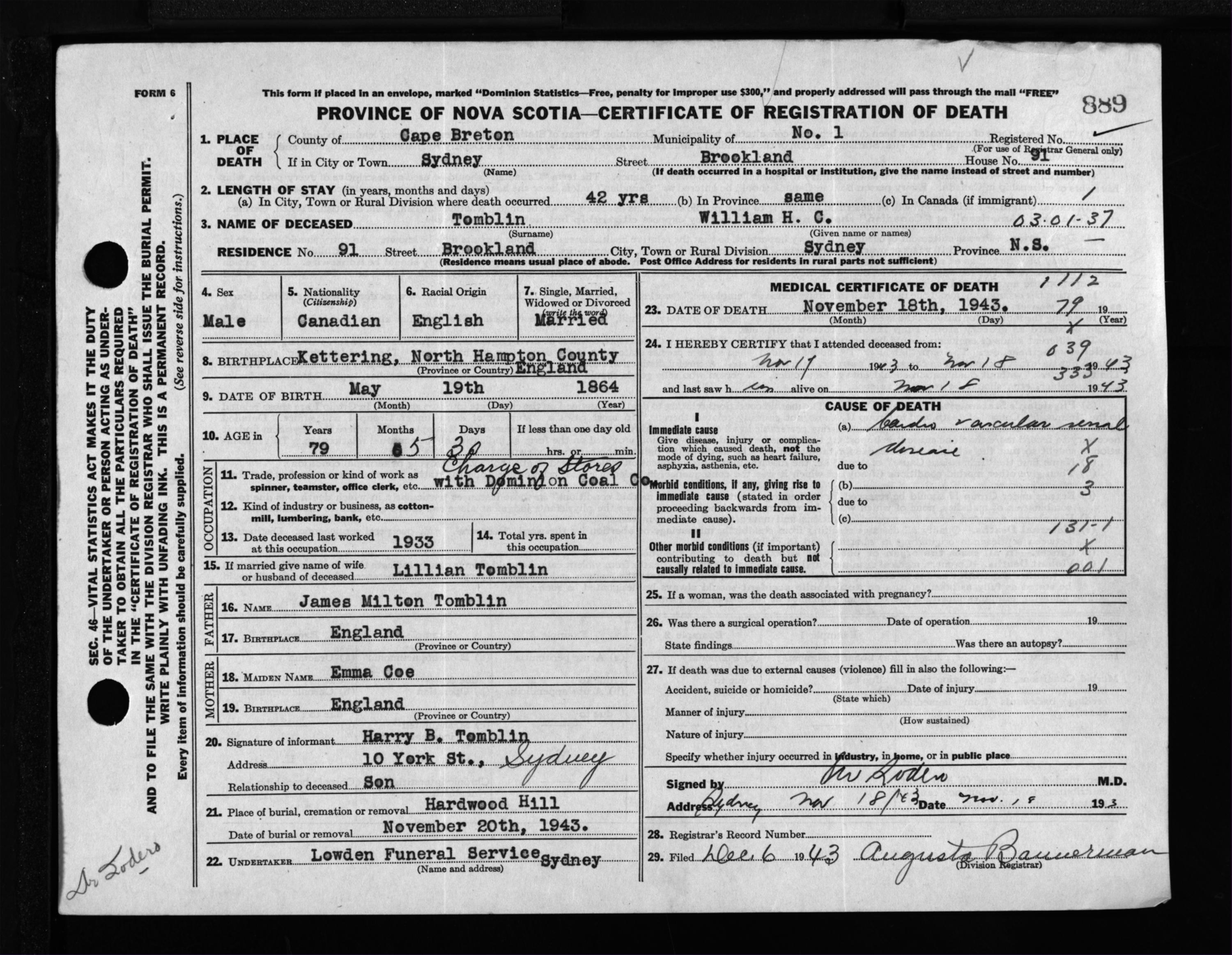 Male Death Registration: Year: 1943 file: 211 number: 889