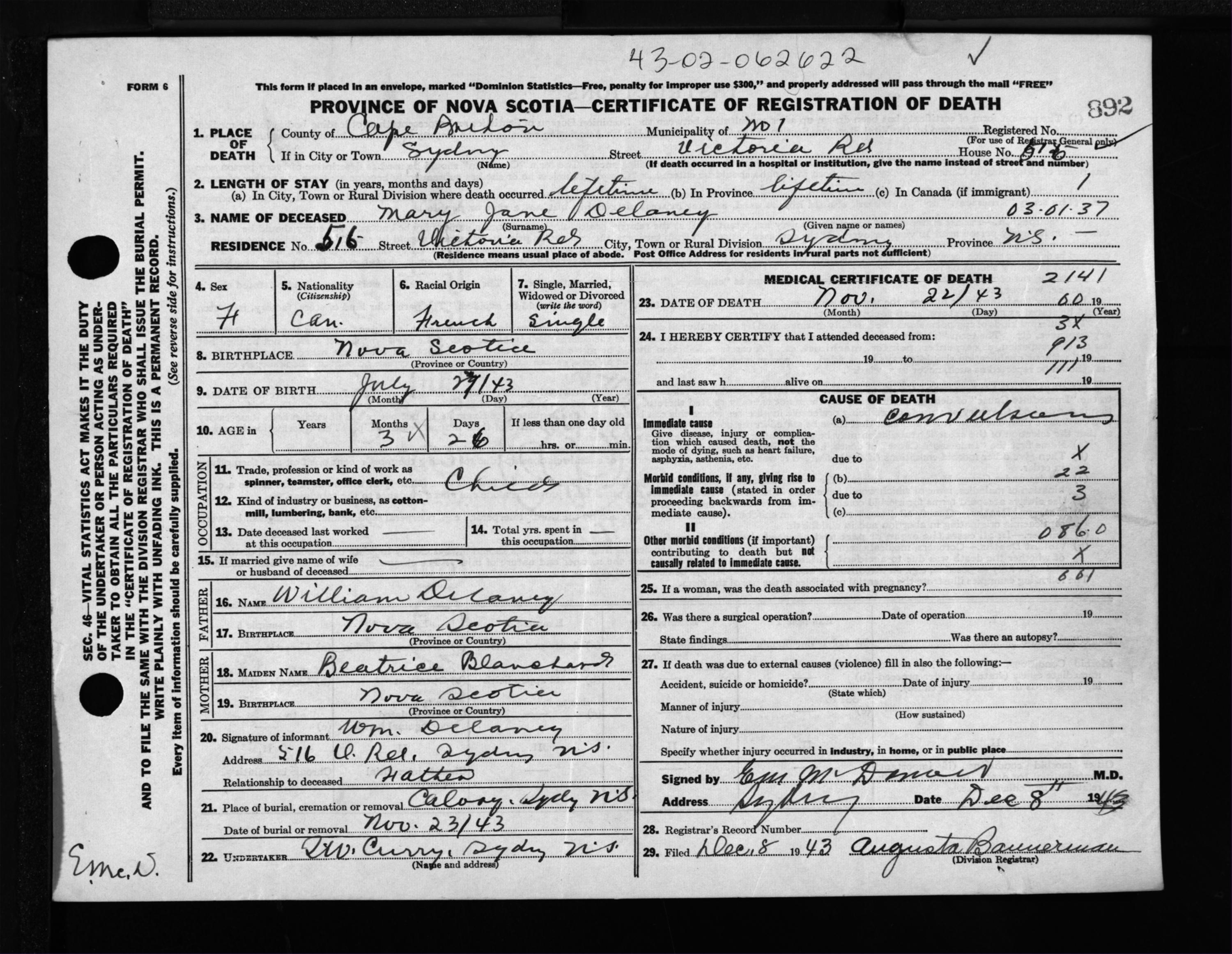 Female Death Registration: Year: 1943 file: 211 number: 892