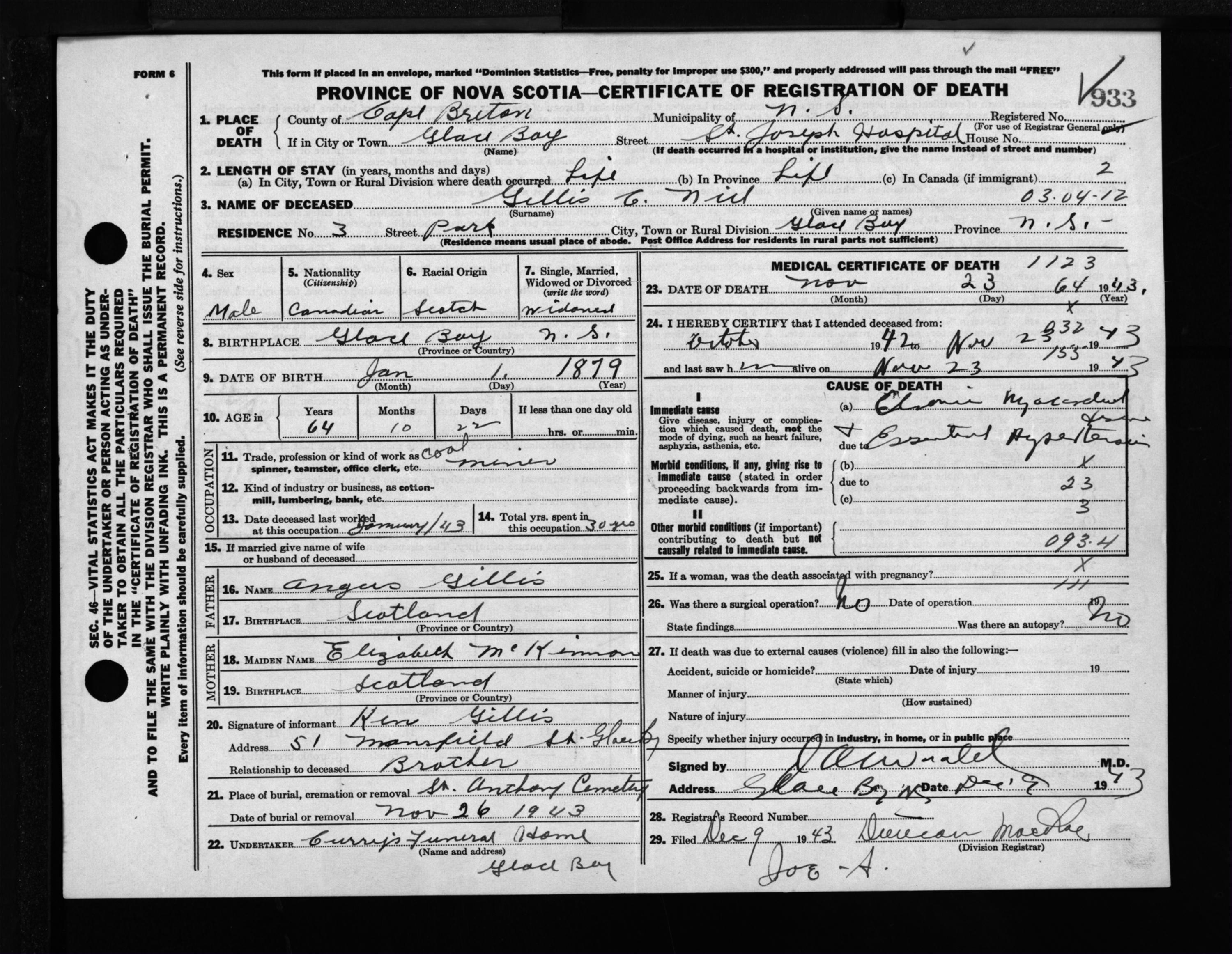 Male Death Registration: Year: 1943 file: 211 number: 933