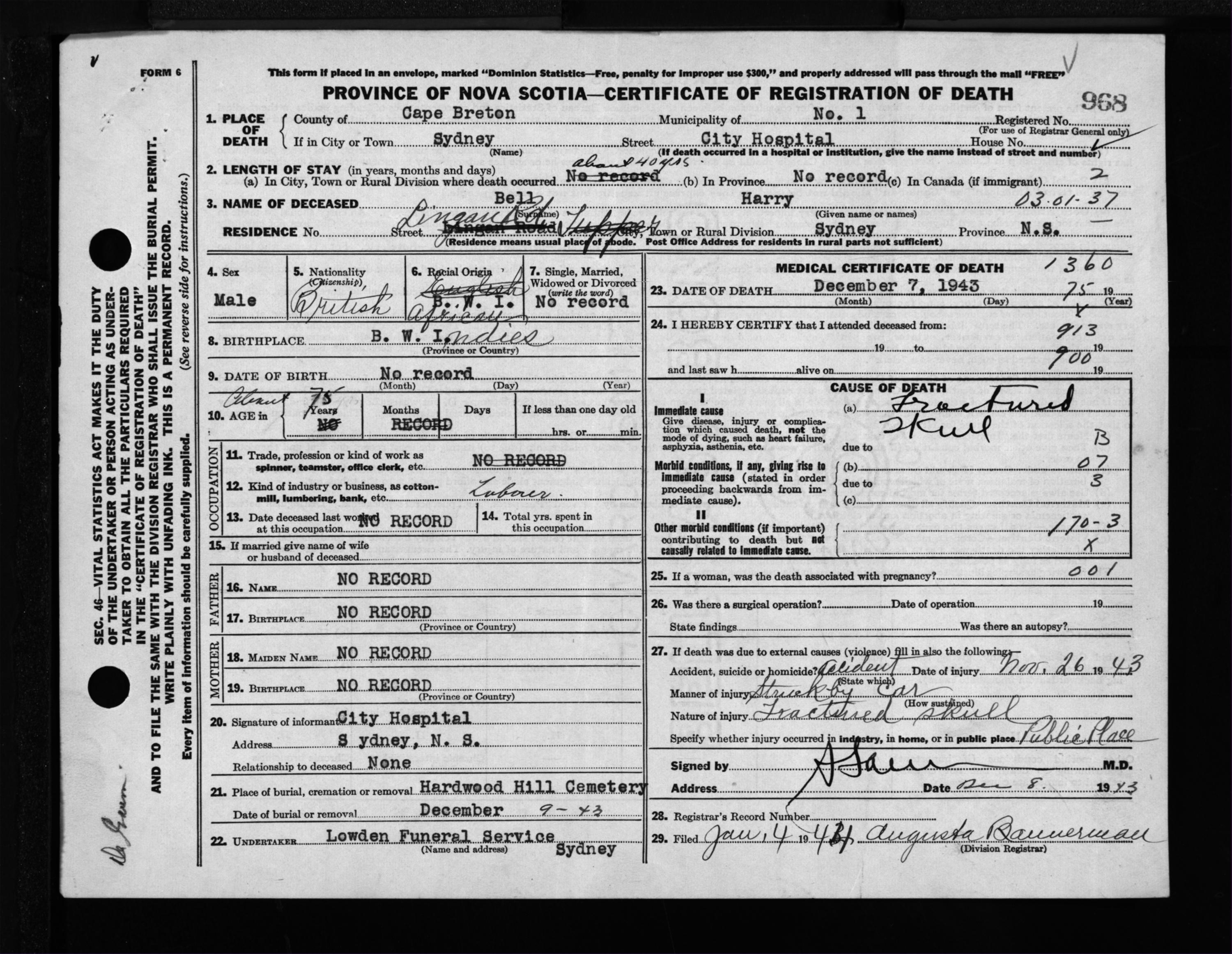 Male Death Registration: Year: 1943 file: 211 number: 968