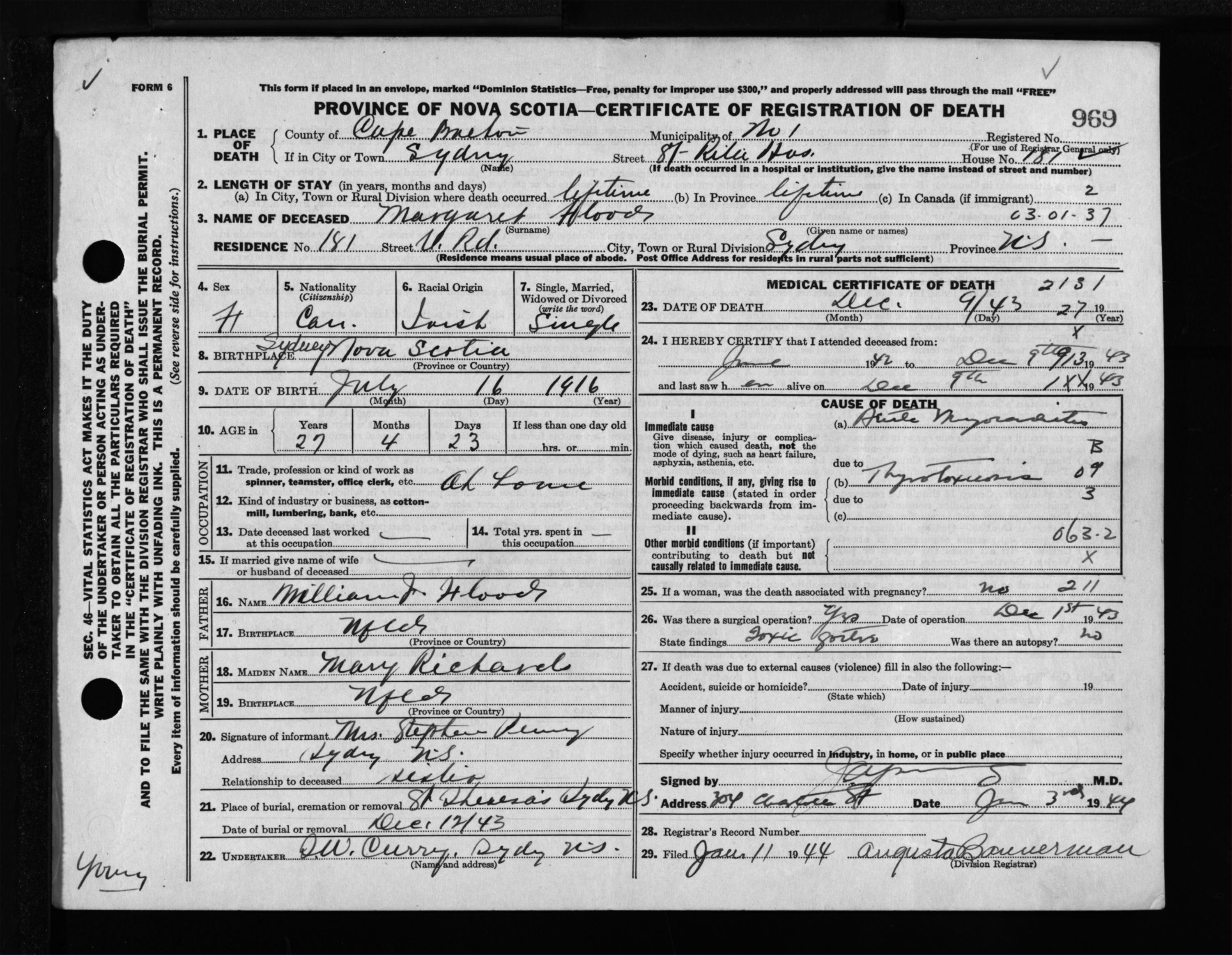 Female Death Registration: Year: 1943 file: 211 number: 969