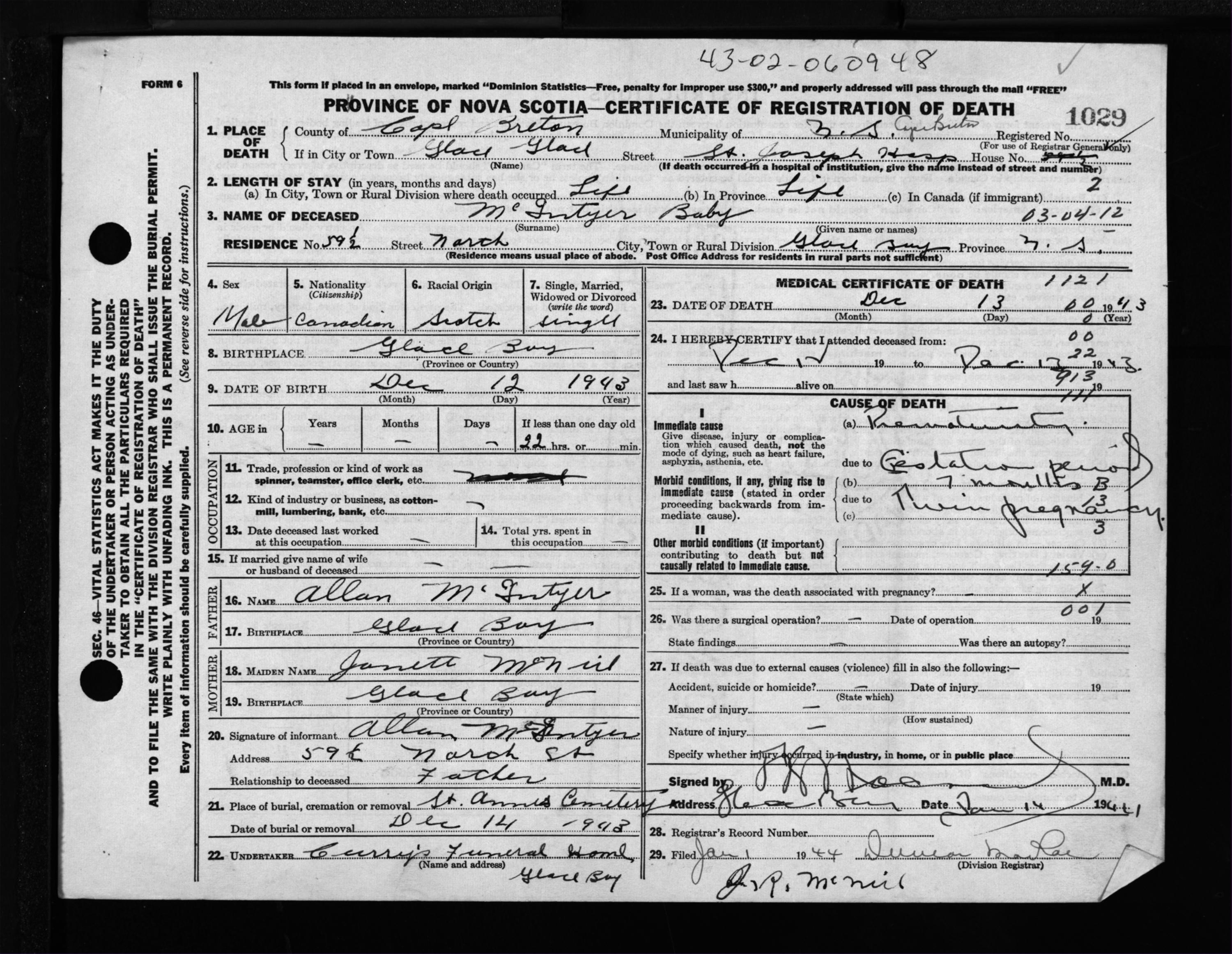 Male Death Registration: Year: 1943 file: 211 number: 1029