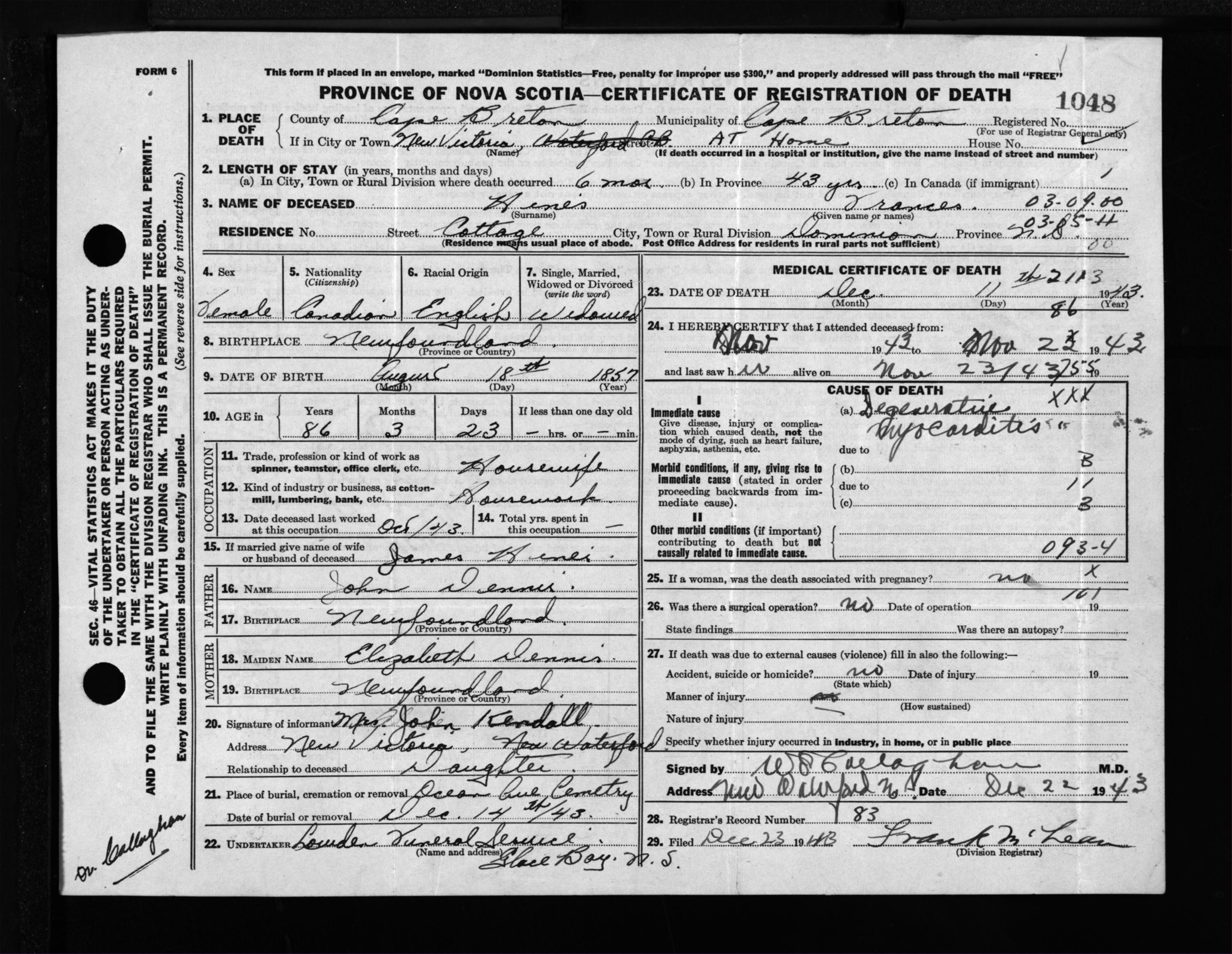 Female Death Registration: Year: 1943 file: 211 number: 1048