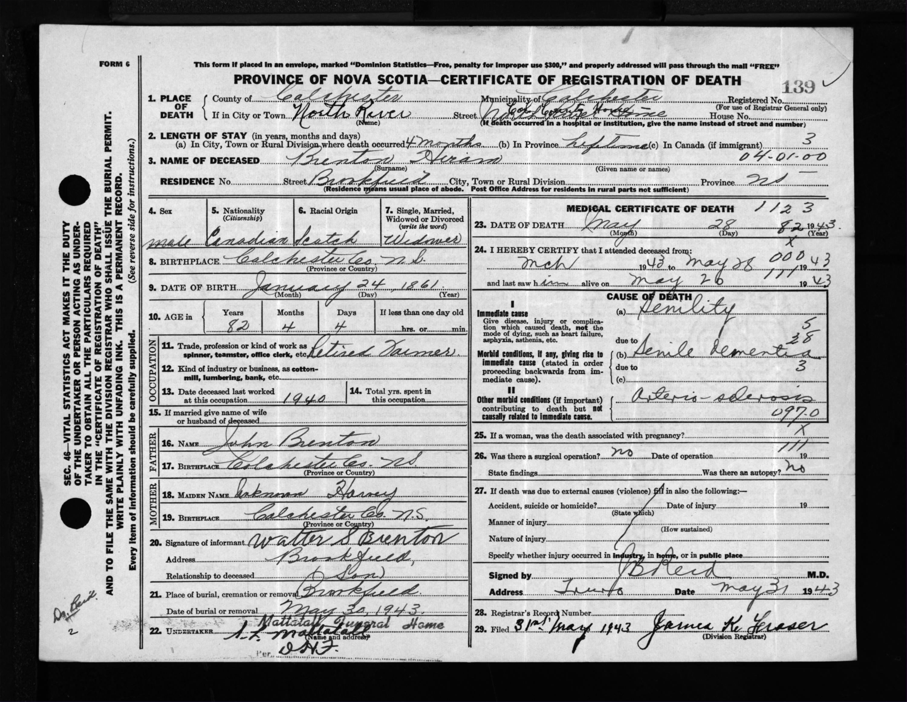 Male Death Registration: Year: 1943 file: 212 number: 139