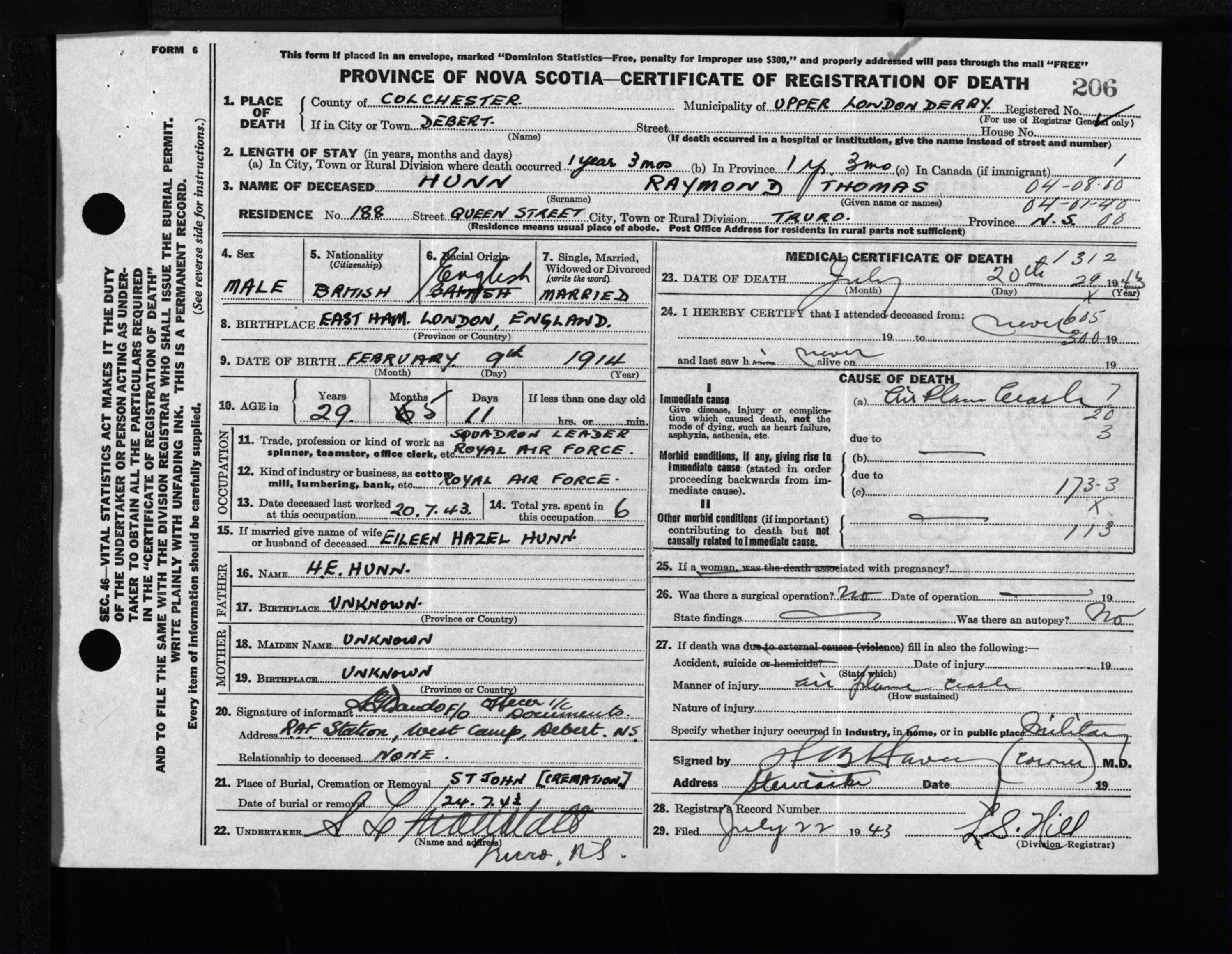 Male Death Registration: Year: 1943 file: 212 number: 206