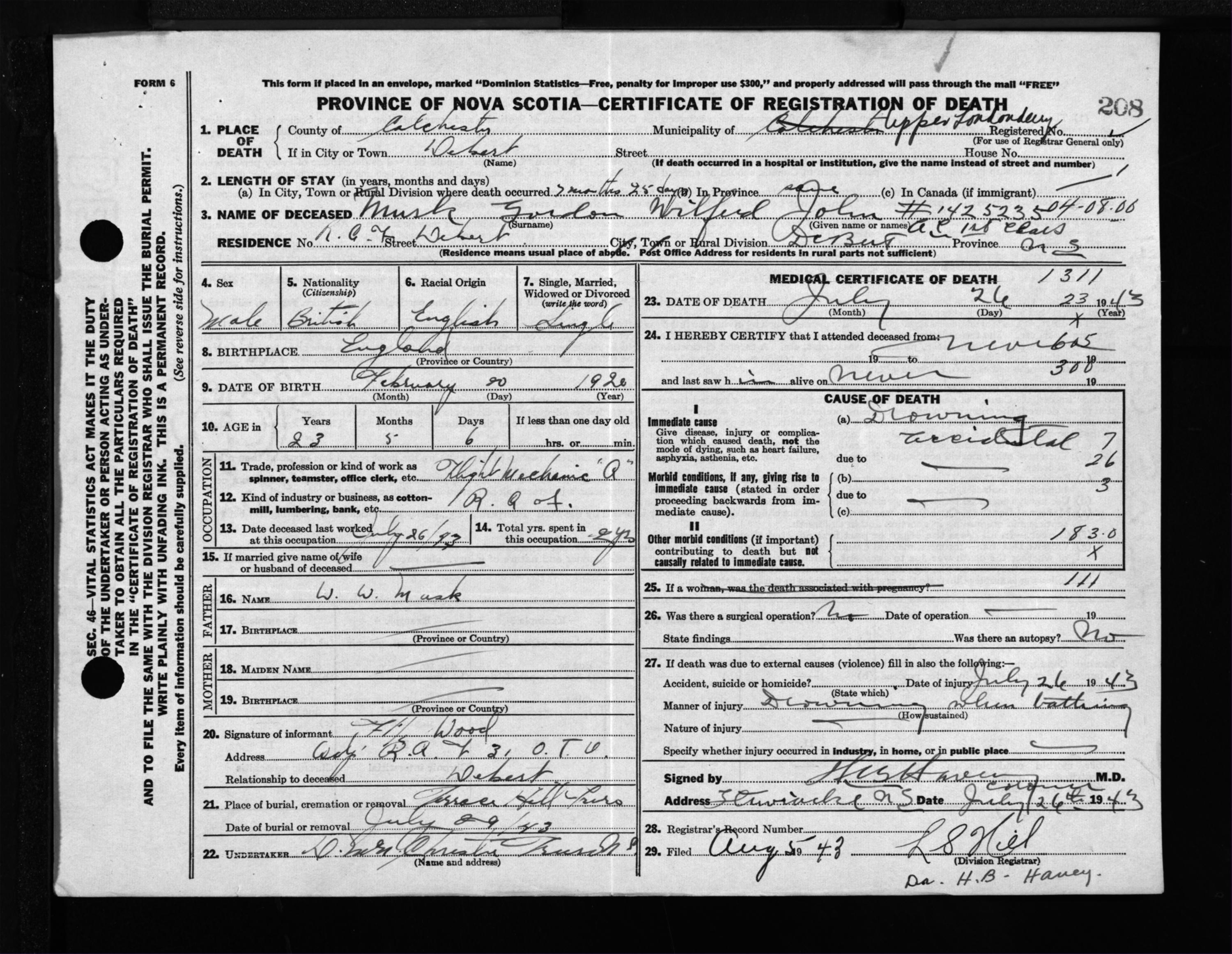 Male Death Registration: Year: 1943 file: 212 number: 208