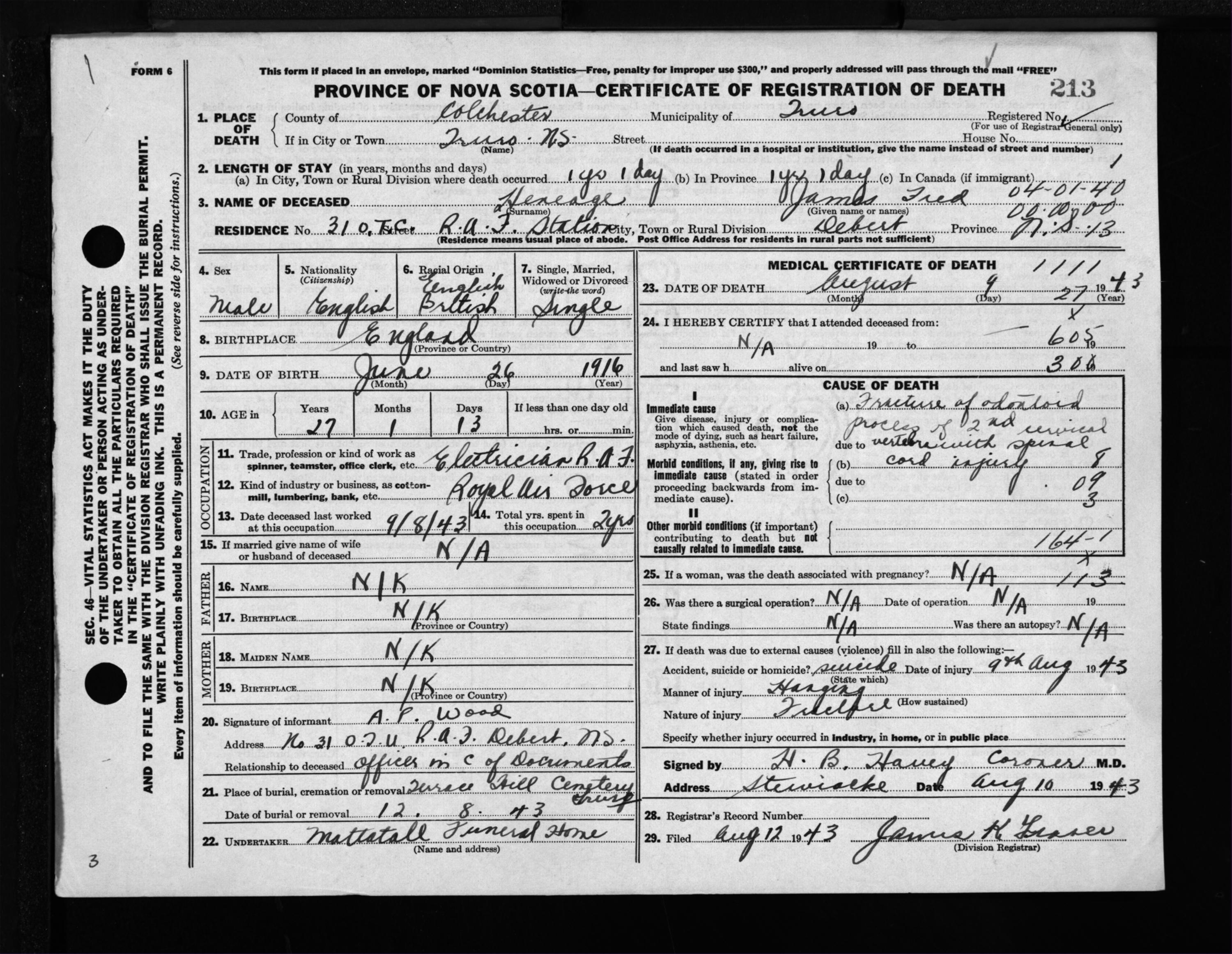 Male Death Registration: Year: 1943 file: 212 number: 213