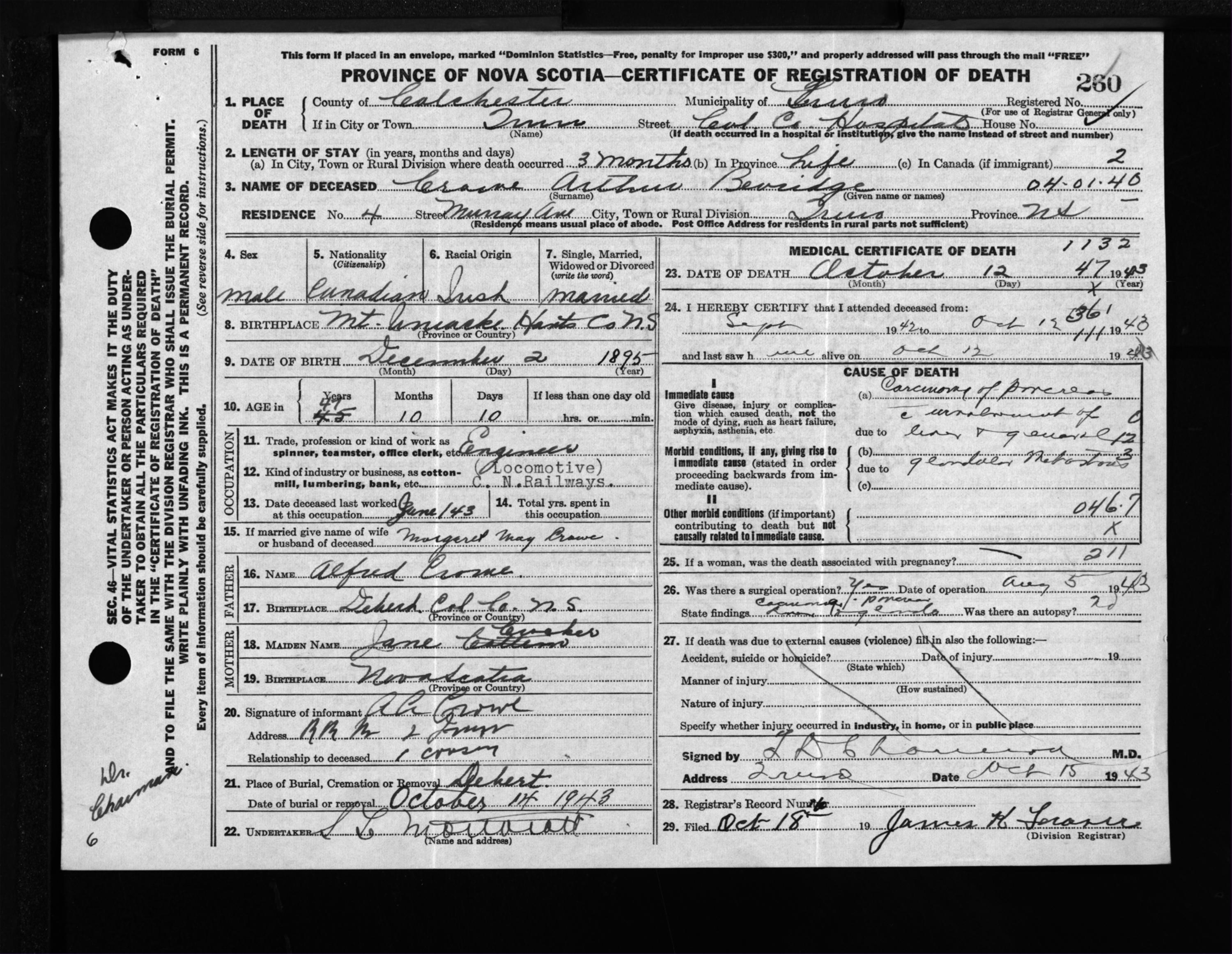 Male Death Registration: Year: 1943 file: 212 number: 260