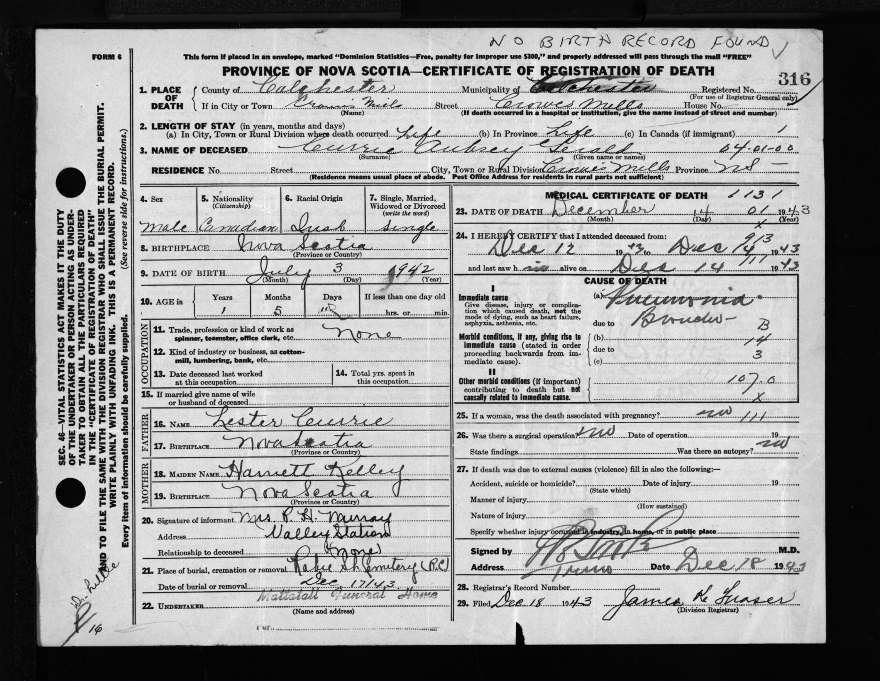 Male Death Registration: Year: 1943 file: 212 number: 316