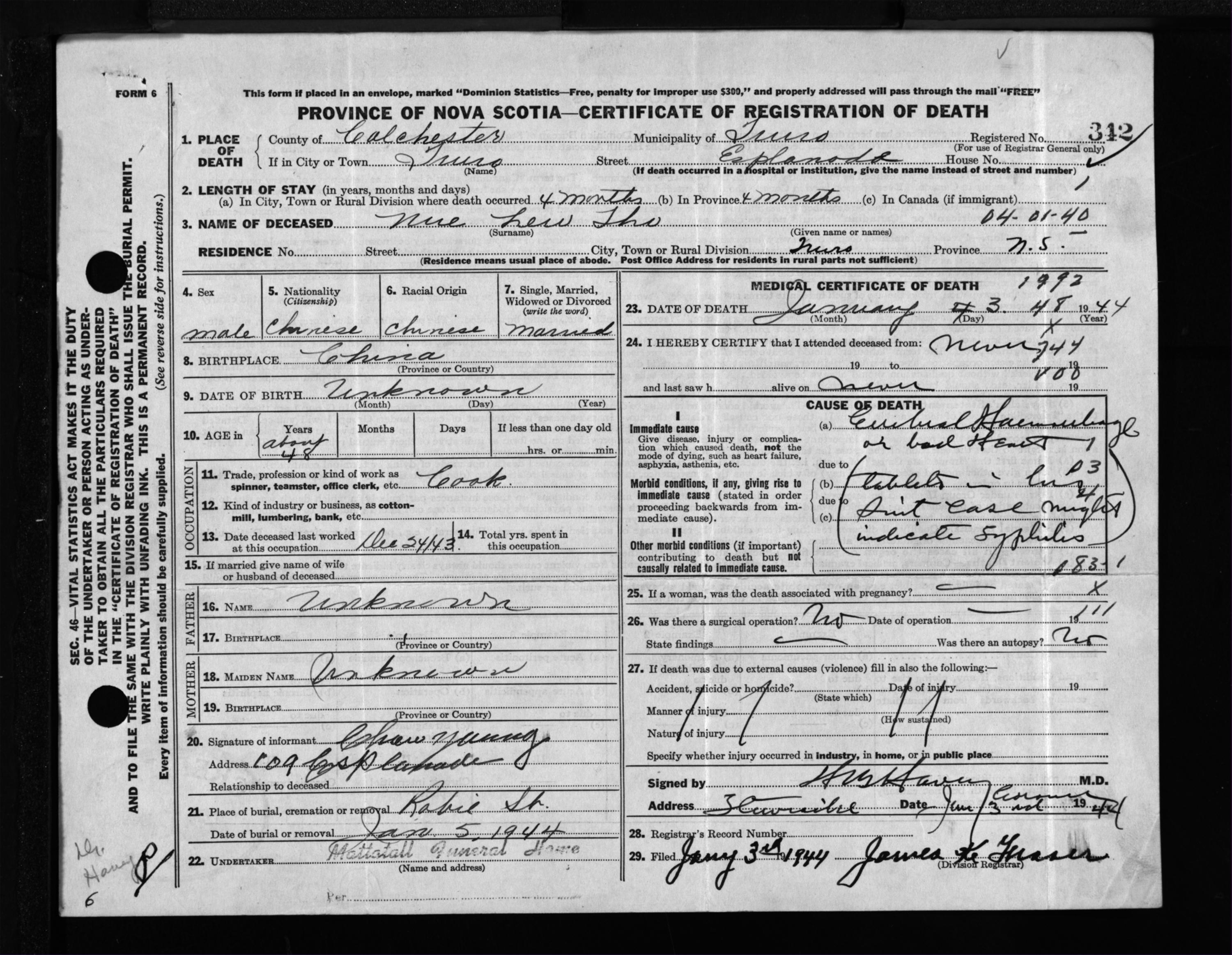 Male Death Registration: Year: 1944 file: 212 number: 342