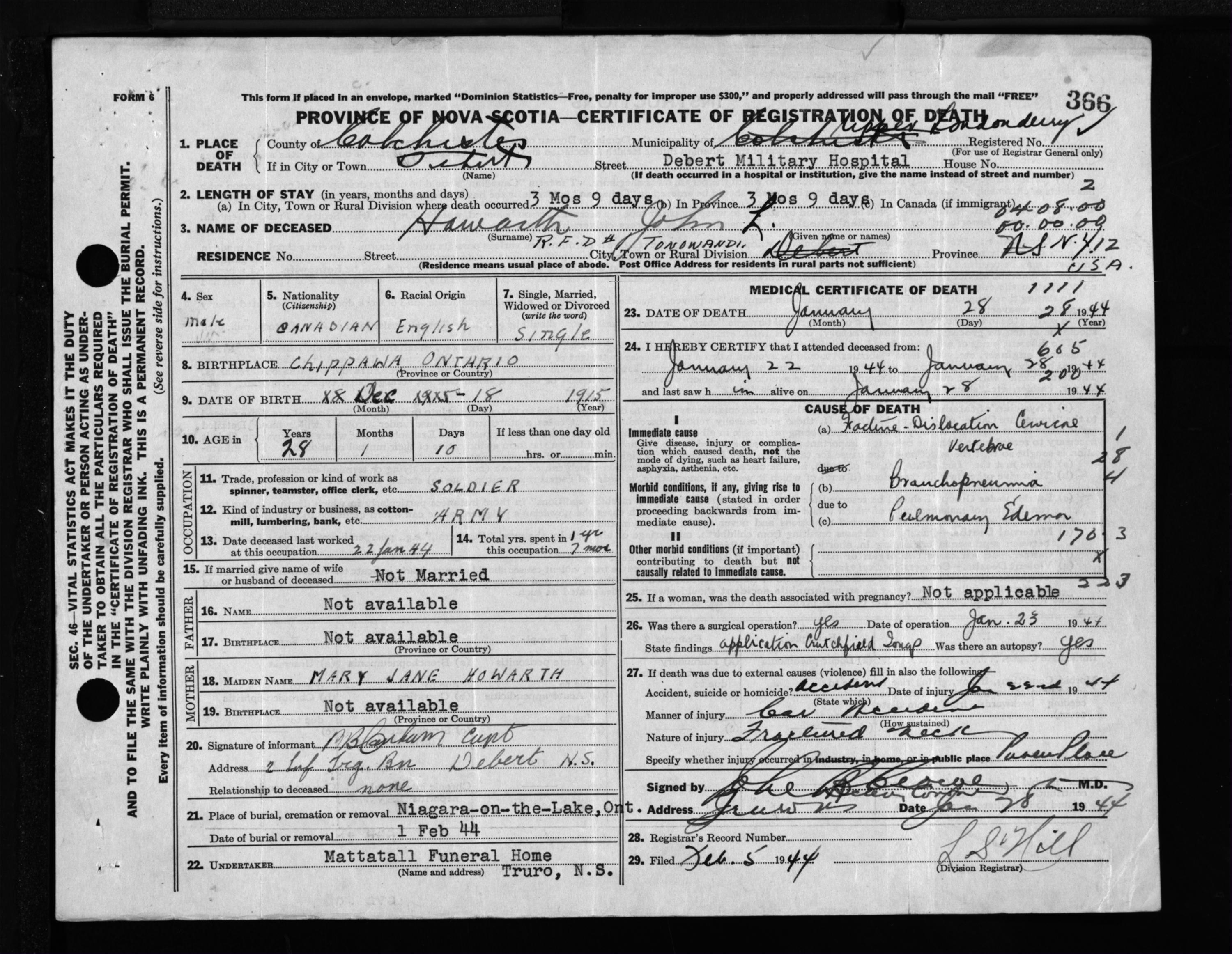 Male Death Registration: Year: 1944 file: 212 number: 366
