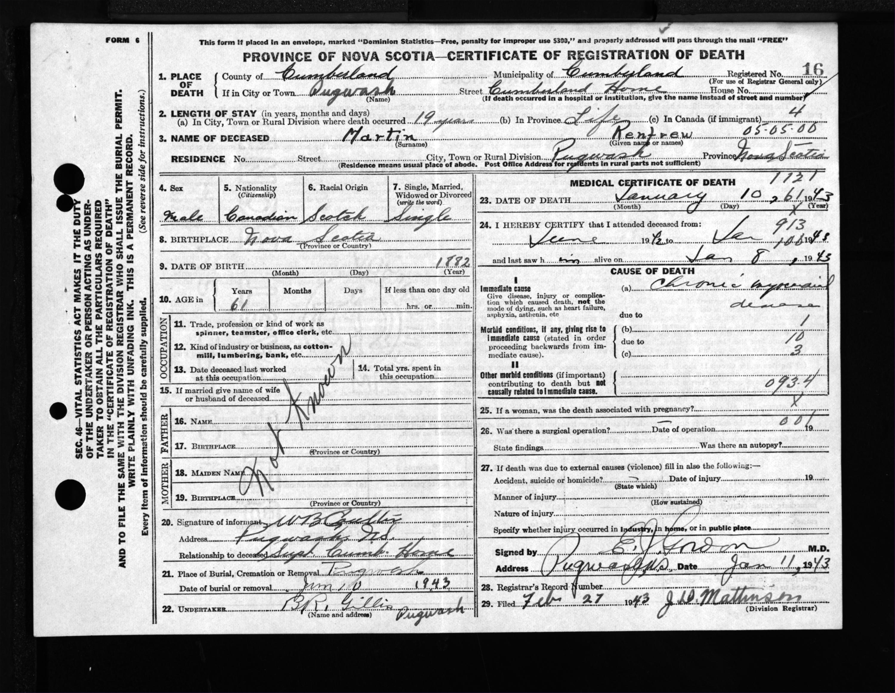 Male Death Registration: Year: 1943 file: 213 number: 16