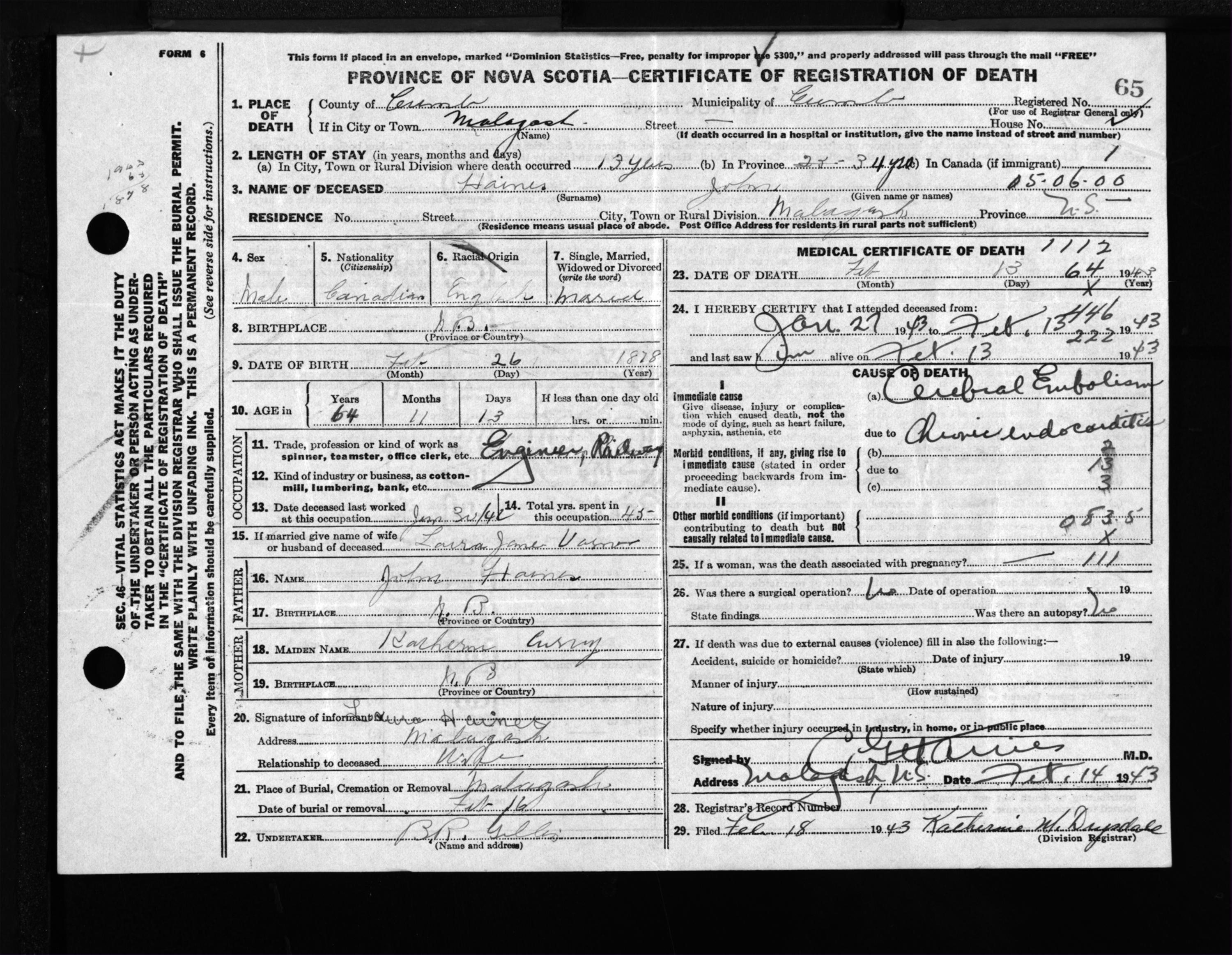 Male Death Registration: Year: 1943 file: 213 number: 65